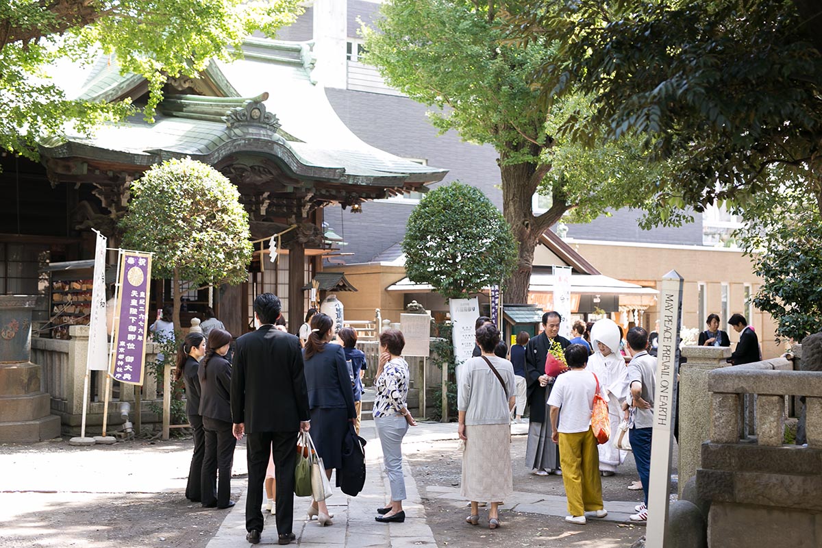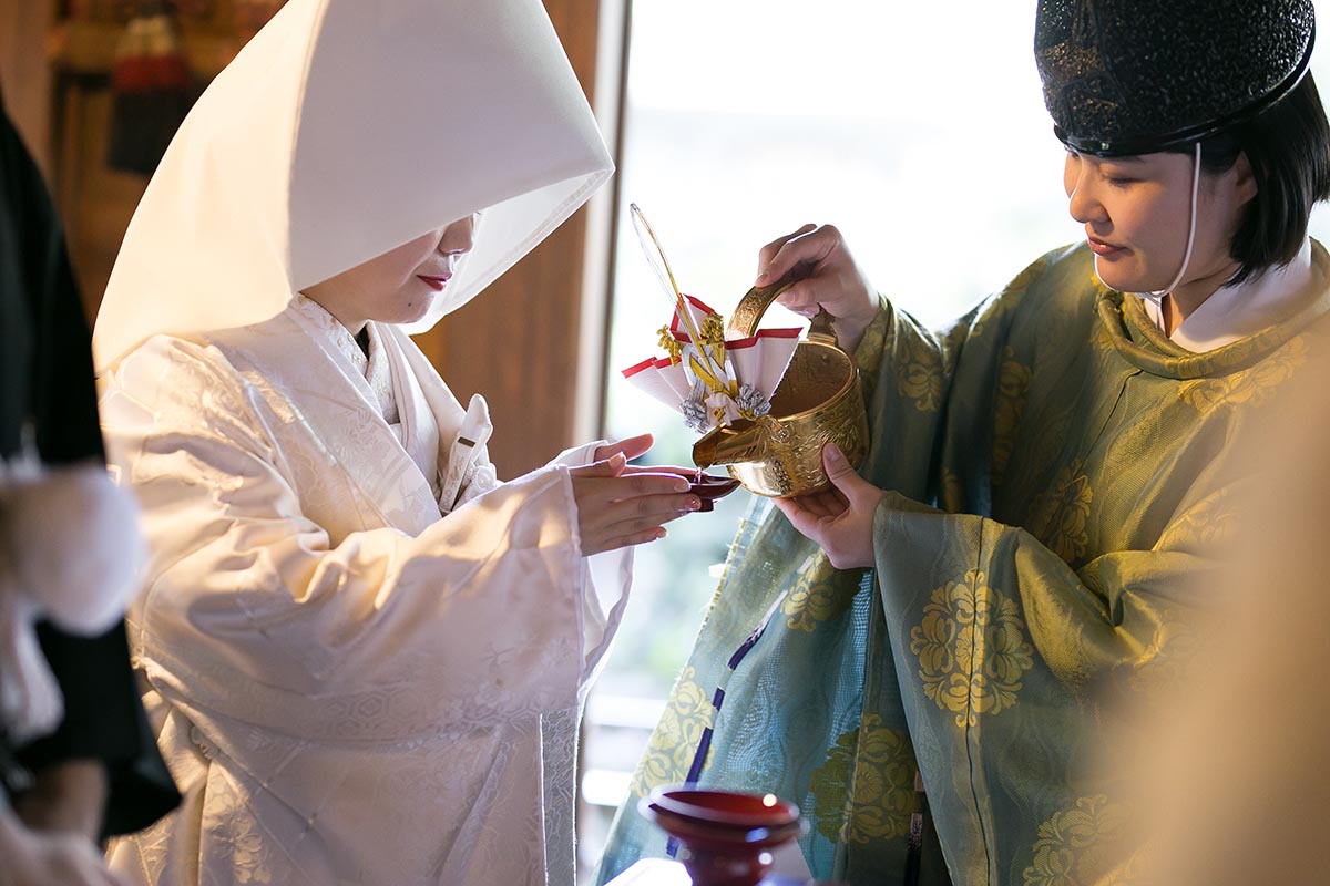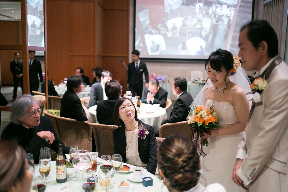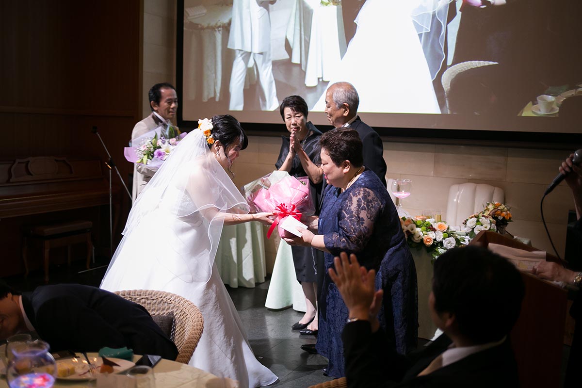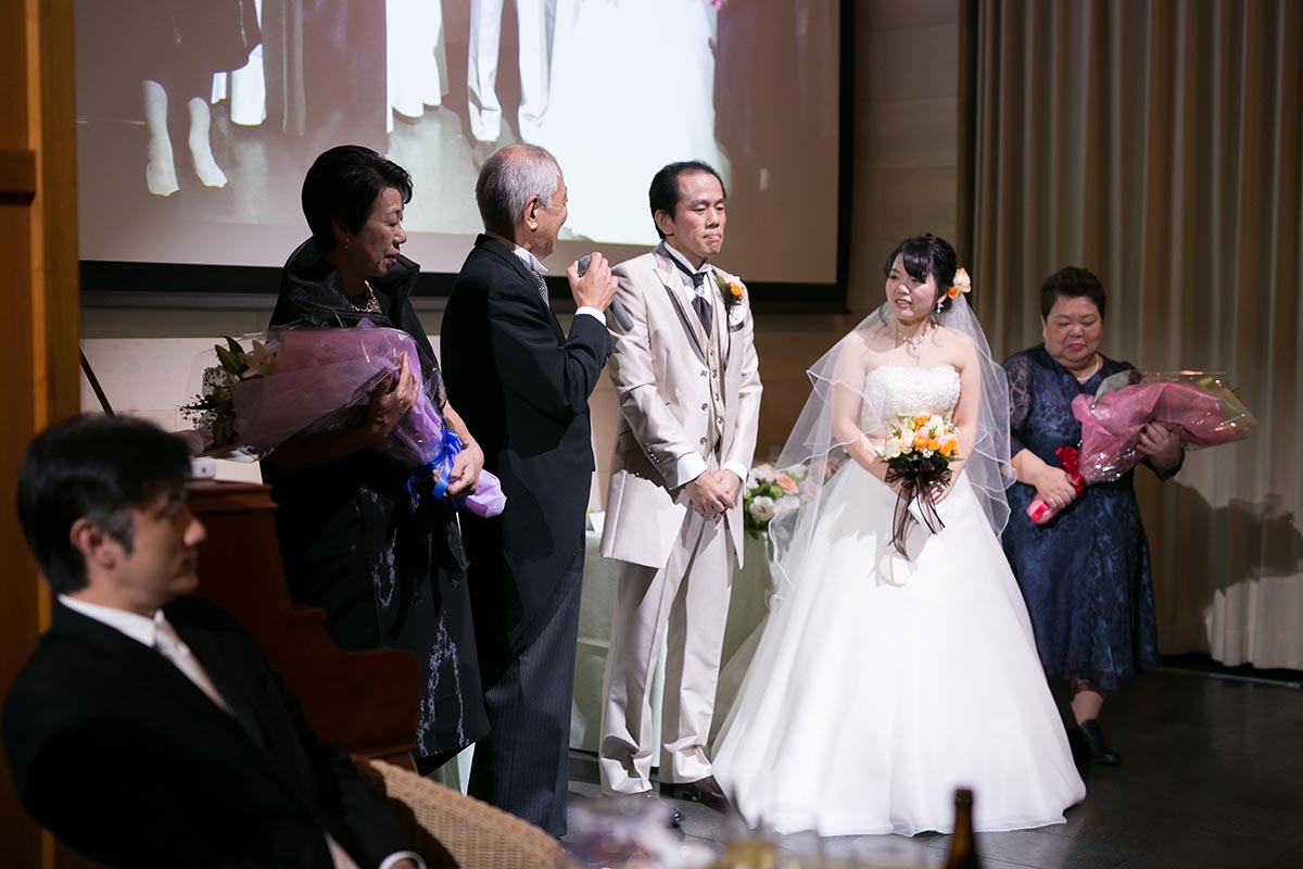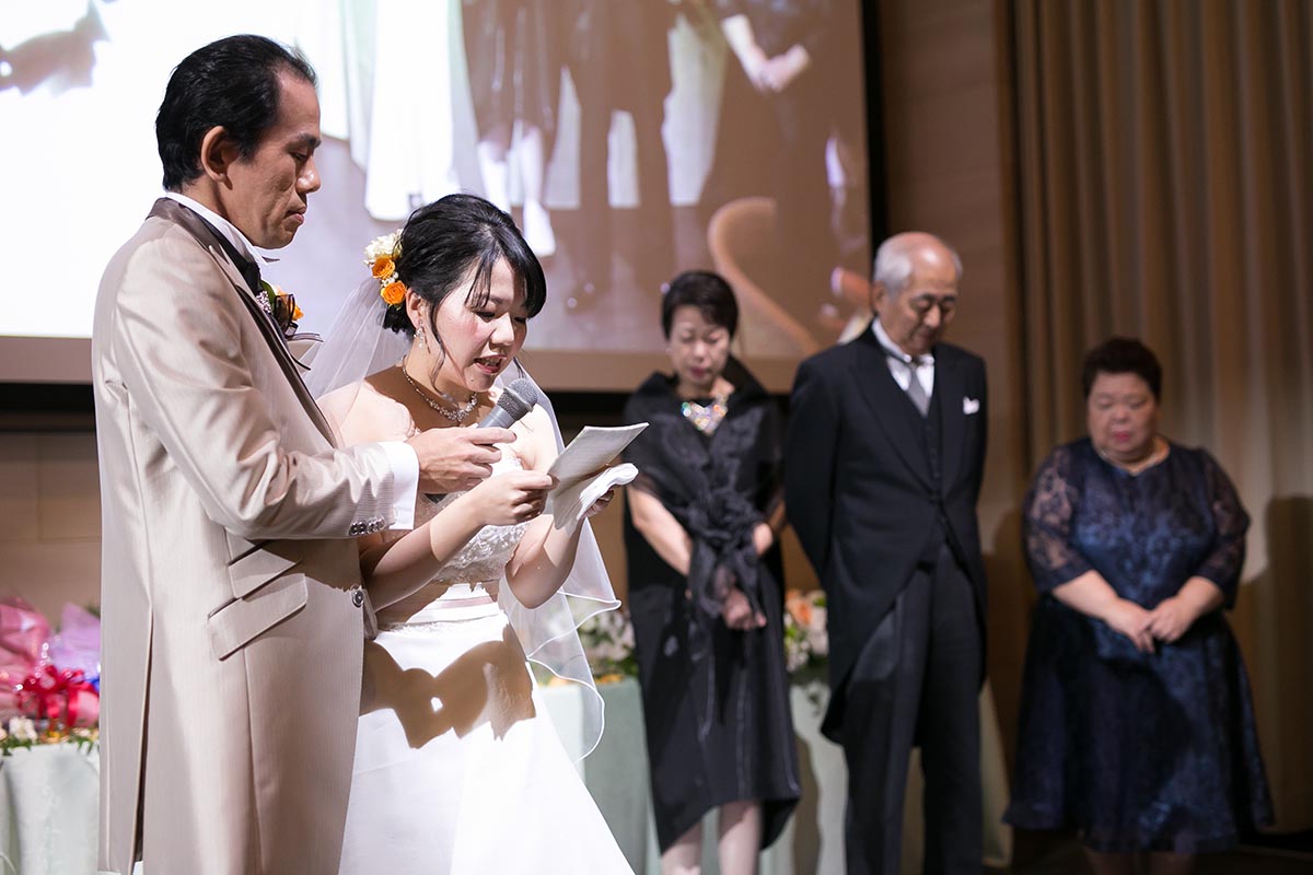 「ゲストの方々と話す時間をたくさん作りたい」というのが一番のこだわりでした。自分が結婚式にゲストとして参列したときに、久々に会えてもあまり話せなかったなと思うことがあったので、できれば一人一人と話す時間を取りたいと考えていました。そのため披露宴の開始前にご挨拶する時間を設けてもらったり、テーブルラウンドの時間を長めにとってもらいました。午前中に神社でお式、午後から披露宴というスケジュールだったのですが、披露宴から参加される方々にも神社での挙式の様子をお伝えしたいということで、当日編集の映像をお色直しの時間に流してもらいました。これが好評で、「晴れ姿きれいだね」と喜んでいただけました。イベントは最小限にしましたが、フラウリーはゲストの方にも参加して楽しんでいただけるかな、ということで取り入れました。会場が暗転し、花びらを入れて光り出した瞬間、わぁと歓声があがり、楽しんでいただけました。