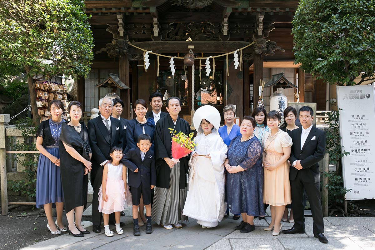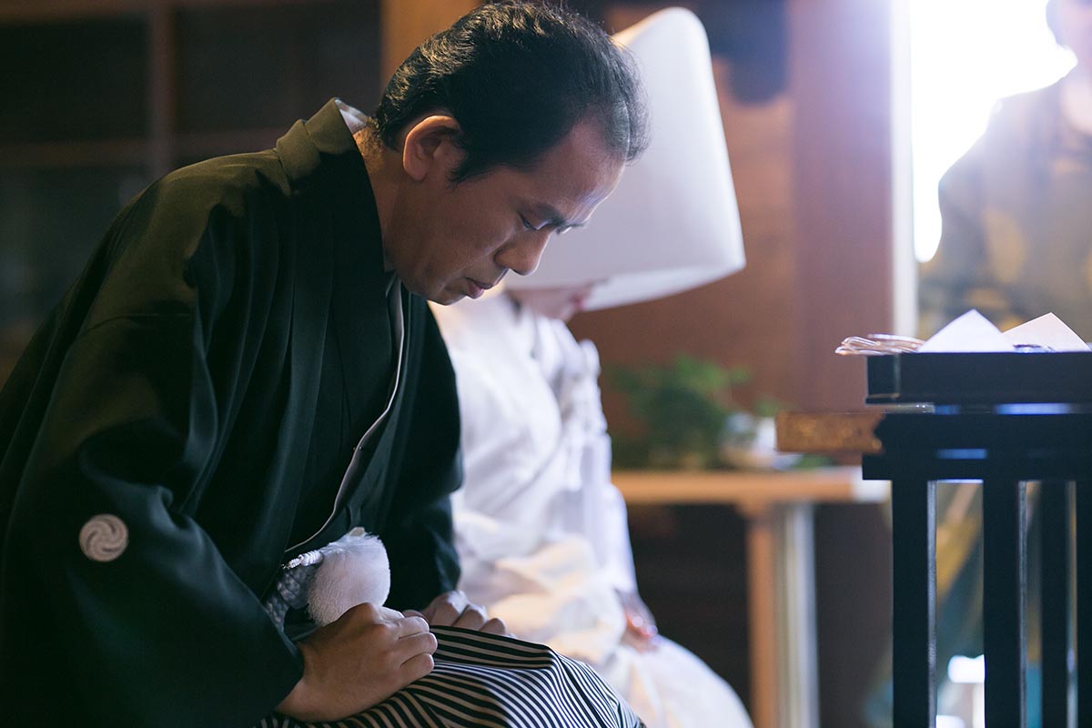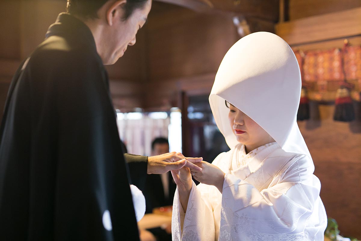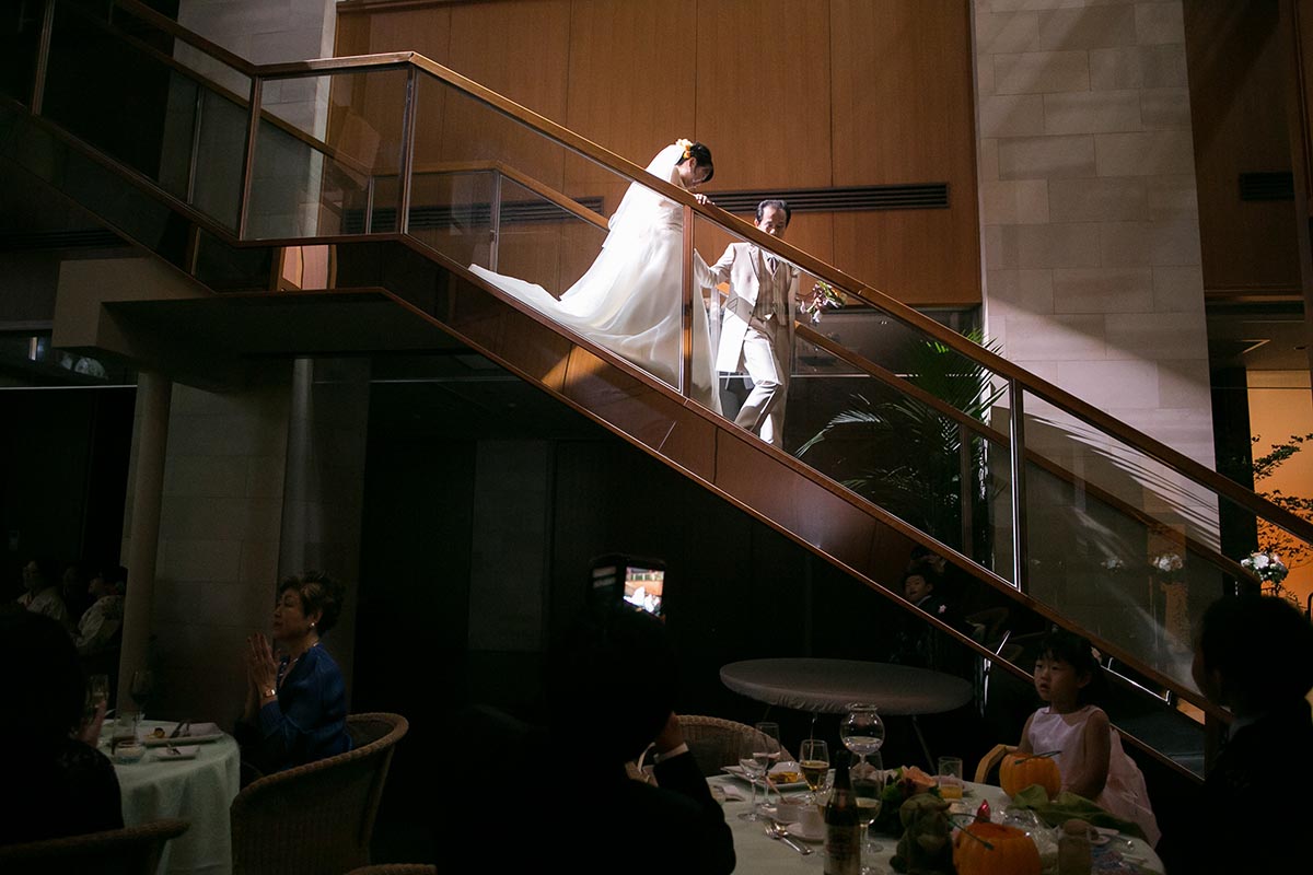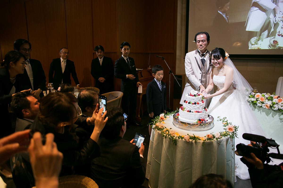 「ゲストの方々と話す時間をたくさん作りたい」というのが一番のこだわりでした。自分が結婚式にゲストとして参列したときに、久々に会えてもあまり話せなかったなと思うことがあったので、できれば一人一人と話す時間を取りたいと考えていました。そのため披露宴の開始前にご挨拶する時間を設けてもらったり、テーブルラウンドの時間を長めにとってもらいました。午前中に神社でお式、午後から披露宴というスケジュールだったのですが、披露宴から参加される方々にも神社での挙式の様子をお伝えしたいということで、当日編集の映像をお色直しの時間に流してもらいました。これが好評で、「晴れ姿きれいだね」と喜んでいただけました。イベントは最小限にしましたが、フラウリーはゲストの方にも参加して楽しんでいただけるかな、ということで取り入れました。会場が暗転し、花びらを入れて光り出した瞬間、わぁと歓声があがり、楽しんでいただけました。