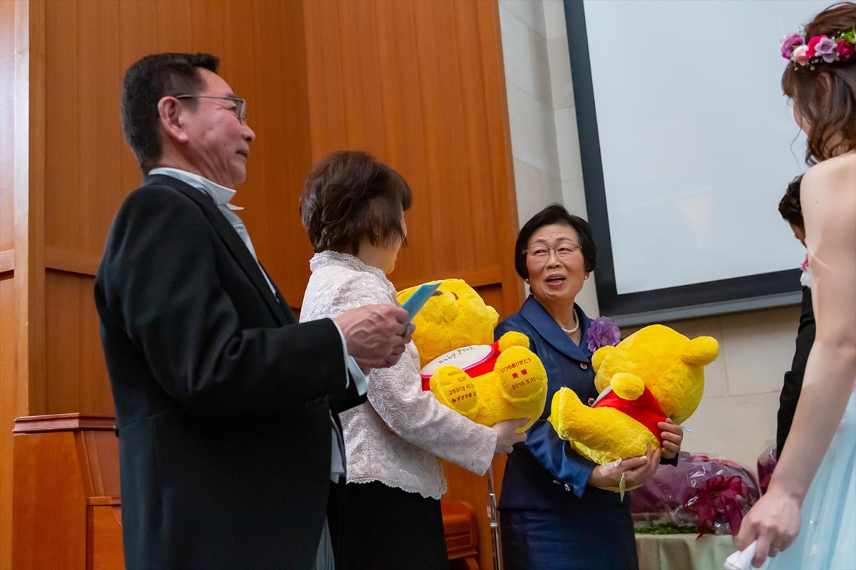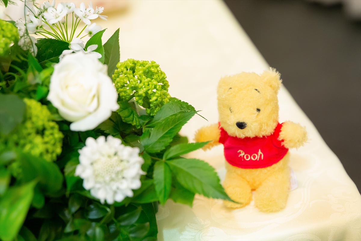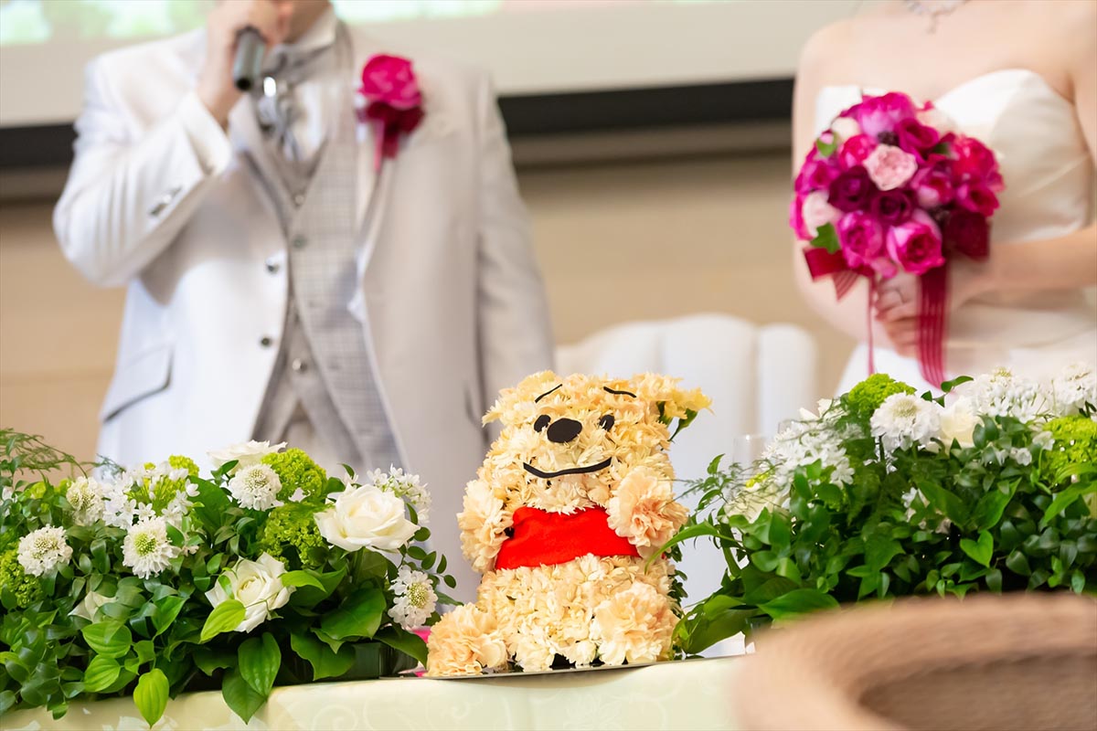 1.カジュアルなウェディングパーティー 形式ばることなく、カジュアルなパーティーにしたいと考えていました。そこで、プランナーさんから、プロフィール紹介はゲストへのインタビュー形式にしたり、ゲスト参加型のゲーム(お肉の格付け)を行ったりという提案を頂きました。当日は、ゲストと一緒に作り上げて、ゲストとの会話を大切にしながら、みんなで楽しむパーティーになったと思います。2.くまのプーさん お花で作ったプーさん、プーさんが埋もれているウェディングケーキ、プーさんのベビードールなど、徹底的にプーさんにこだわりました。いずれも、プランナーさんからのご提案を参考にして決めました。