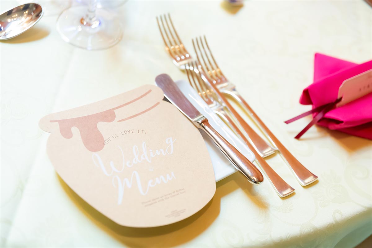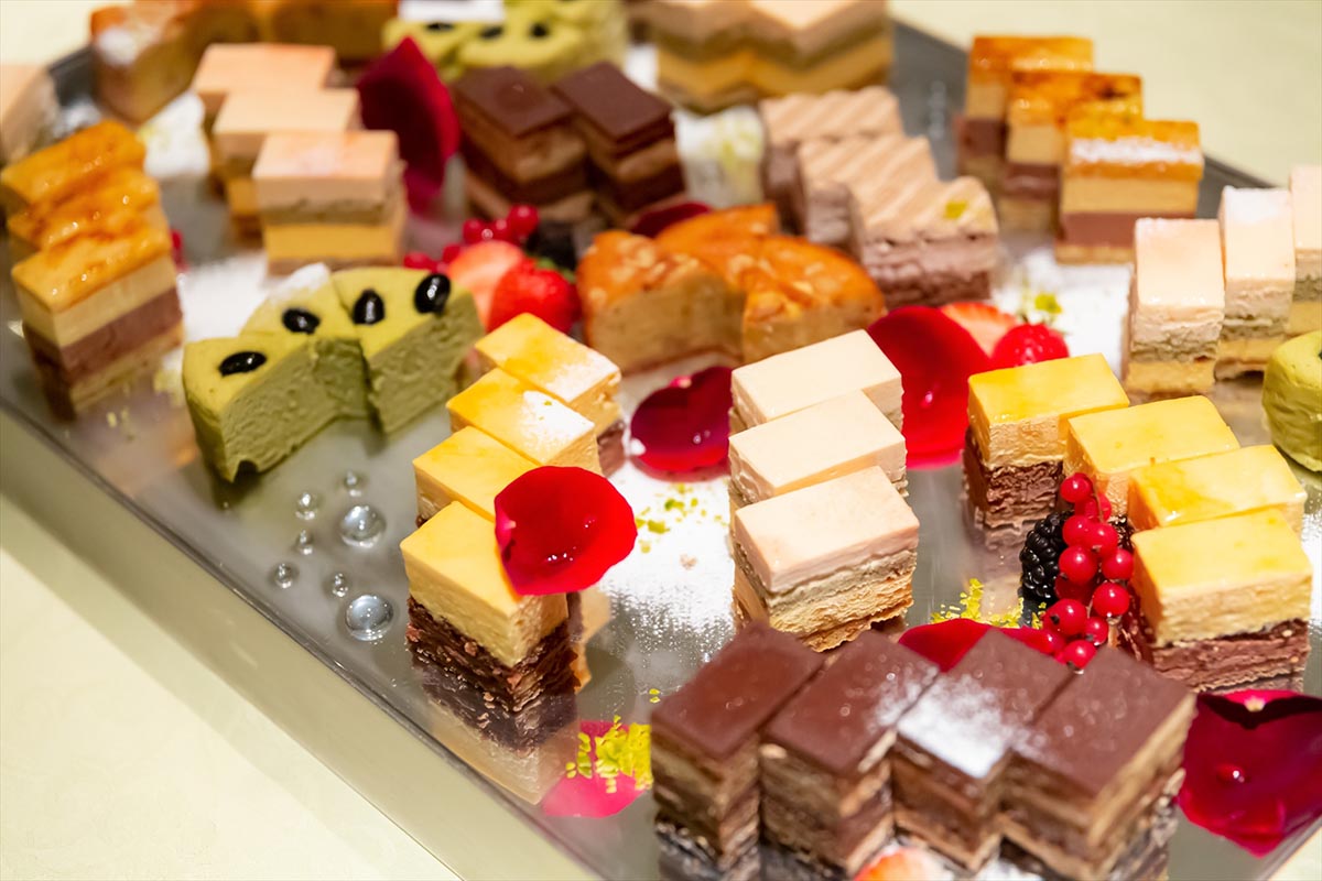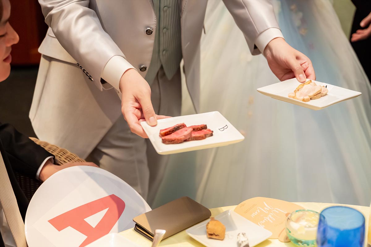 王道フレンチ、日本風フレンチのいずれかを、ゲストに選んでもらう形式にしました。これは、招待状に各フレンチのメニューカードを同封して、ゲストに選んでもらうというものです。多くのゲストから、「招待状にメニューカードが入っているのは初めて」という驚きと喜びの声を頂きました。また、デザートビュッフェでは、デザートの内容を具体的にリクエストし(フロマティックで出しているチーズケーキなど)、リクエストしたものは全て当日のビュッフェに反映されていたので、とても感謝しています。たくさんのゲストから、「料理が本当に美味しい!」と喜んでいただきました。