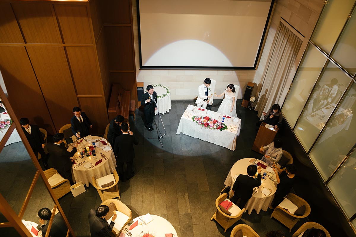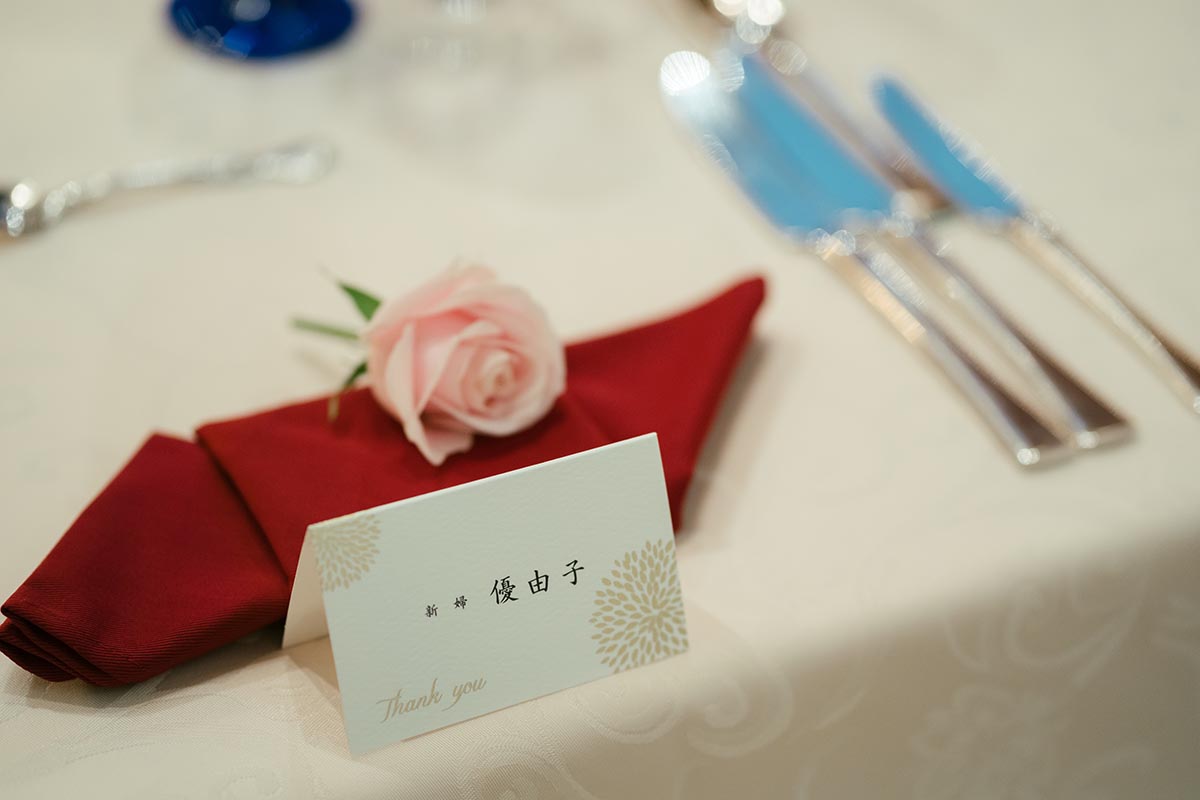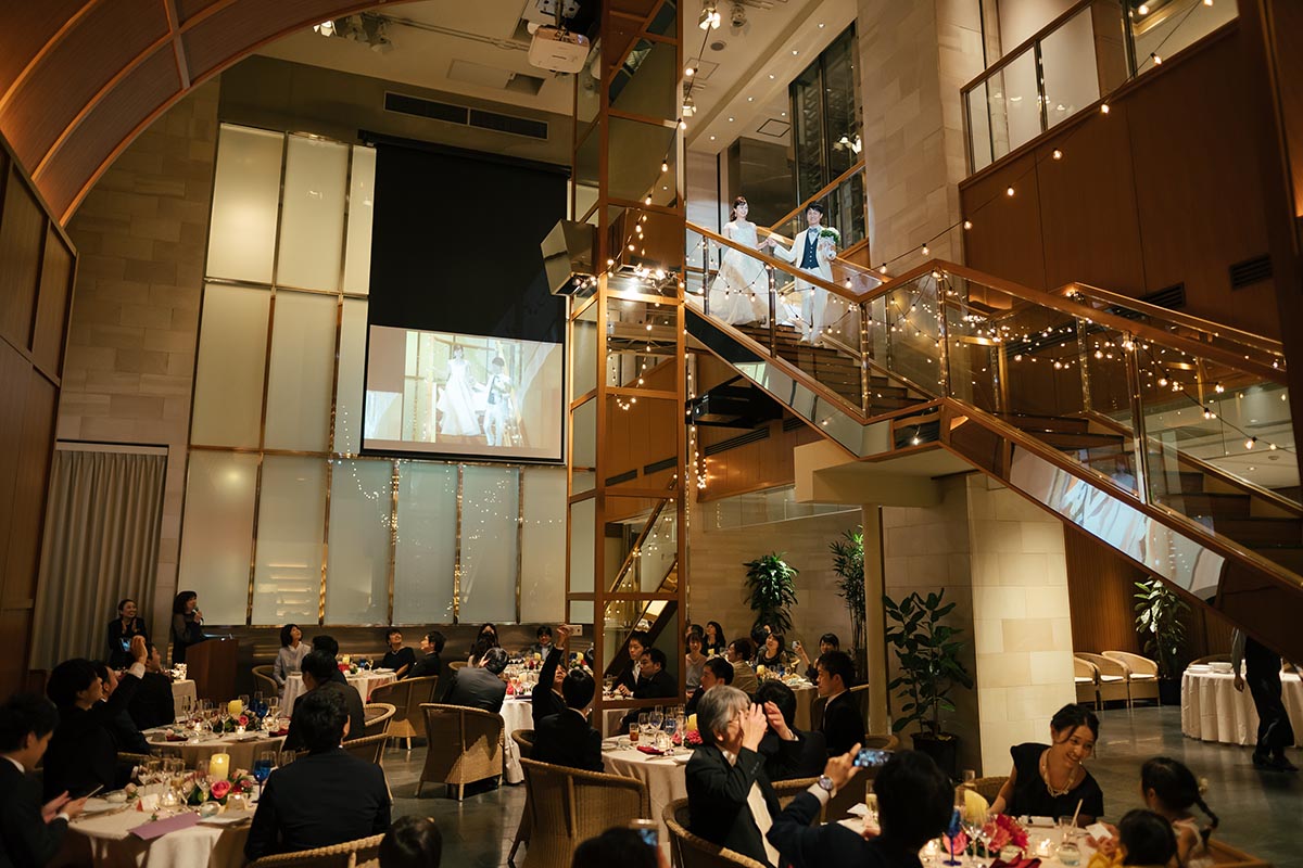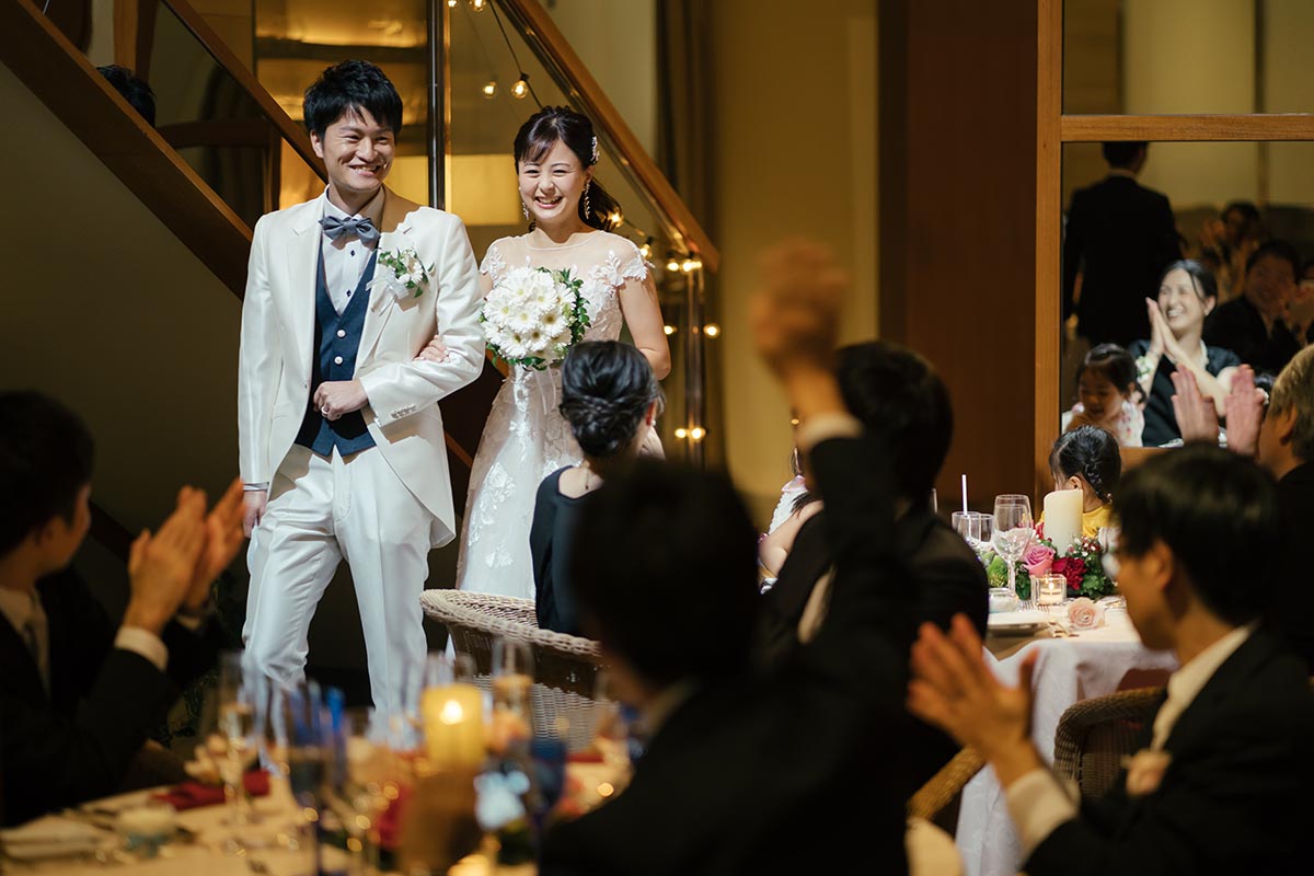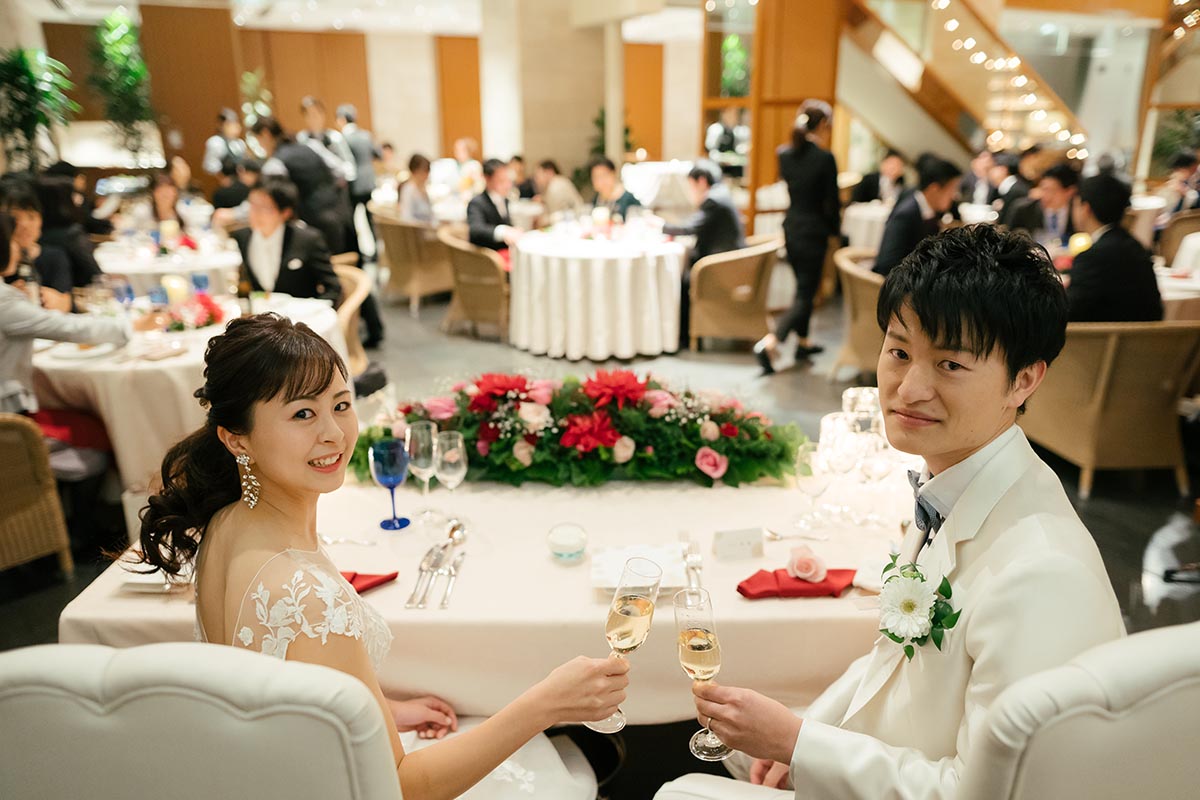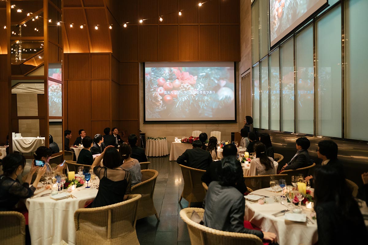 特にこだわったのは、”二人らしさ”です。固い雰囲気はどうも苦手な私たちでしたので、テーマである「感謝を伝える」という点は忘れず、可能な限り楽しく、明るい雰囲気になるような会場の花や、ケーキではなく、ローストビーフをお願い致しました。また、クリスマスが近かったこともあり、色合いもクリスマスを意識した配色にしました。そして、ラリアンス様にはプロのアドバイスを頂きつつも、わがままを受け入れてもらいました!余興はなかったのですが、スモークガラスの演出・階段からの演出・ビュッフェなどを組み合わせることで、盛りだくさんな式にすることができました。