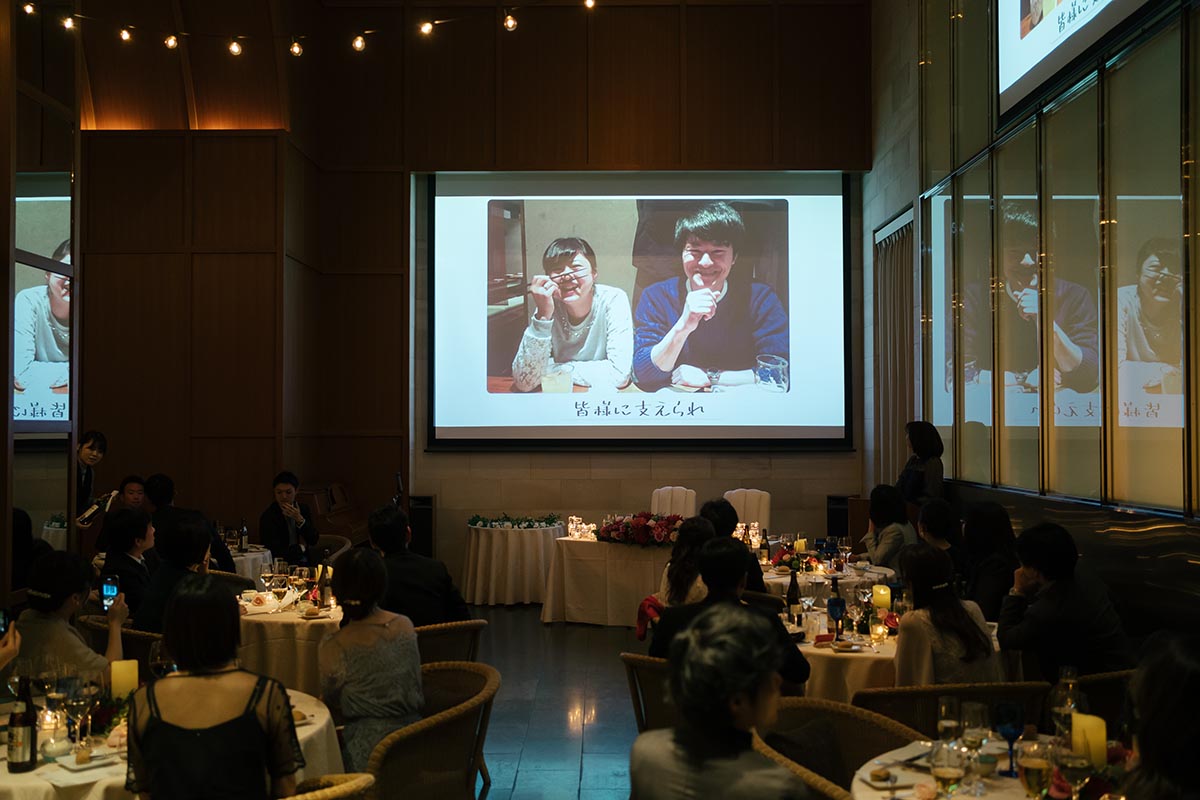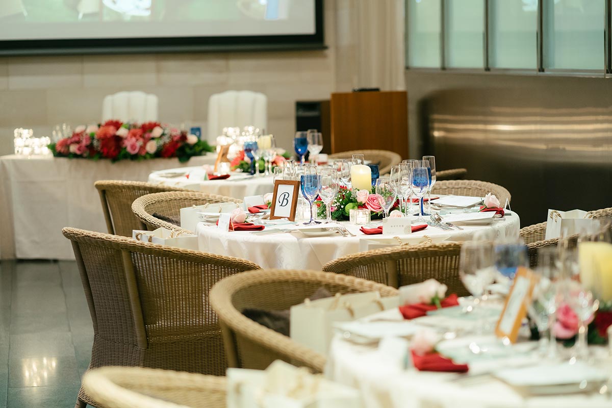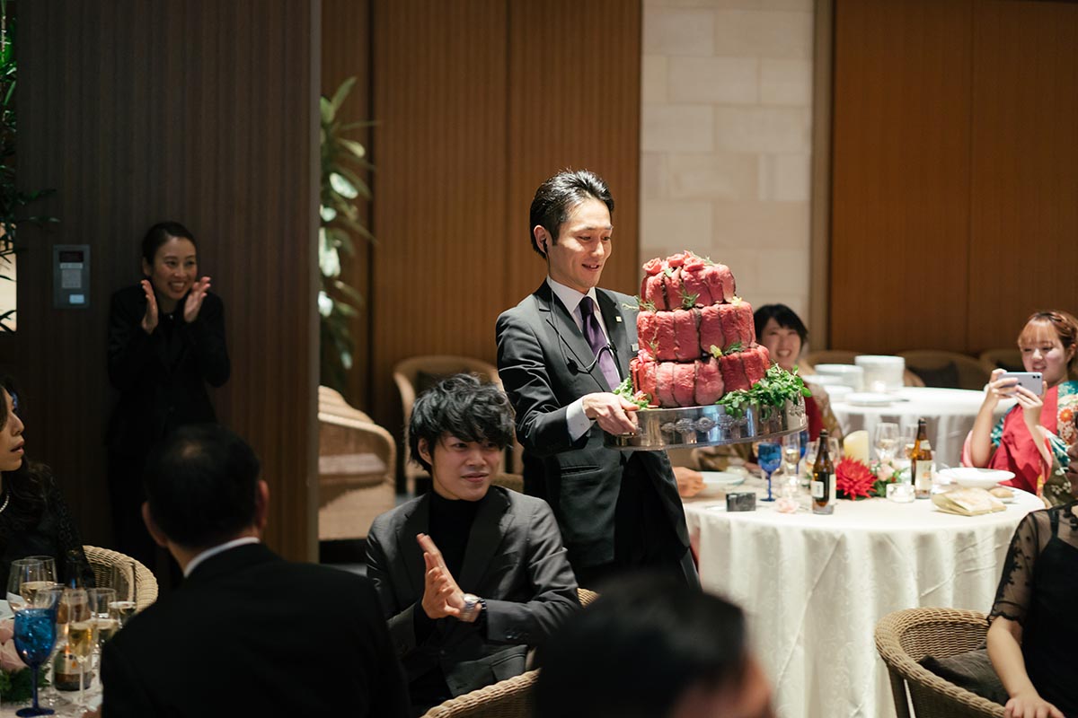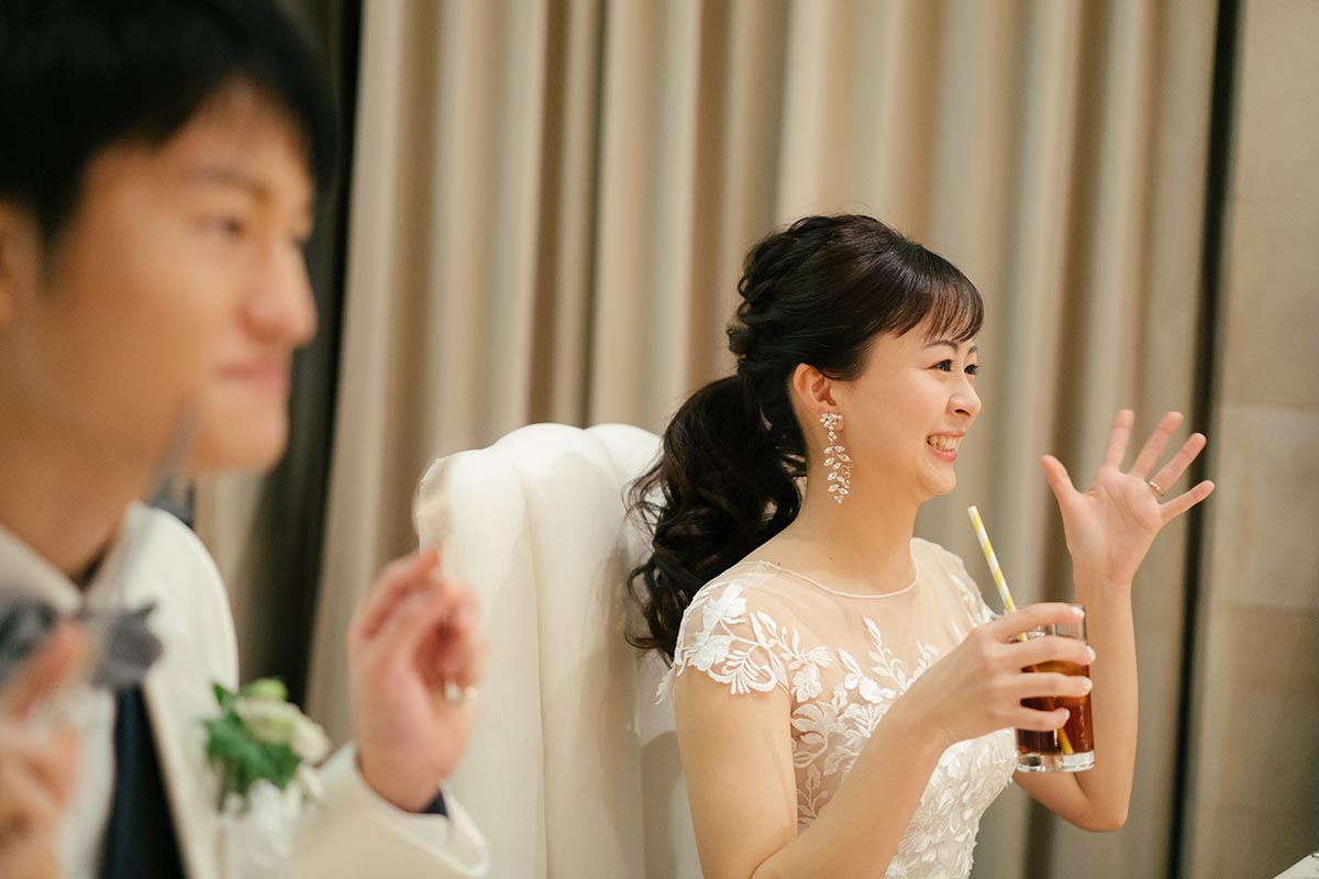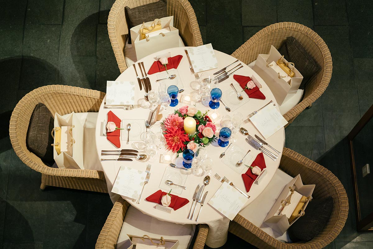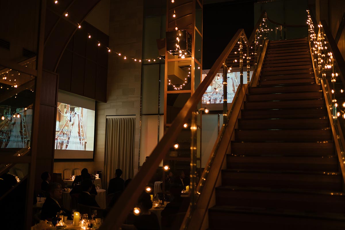 特にこだわったのは、”二人らしさ”です。固い雰囲気はどうも苦手な私たちでしたので、テーマである「感謝を伝える」という点は忘れず、可能な限り楽しく、明るい雰囲気になるような会場の花や、ケーキではなく、ローストビーフをお願い致しました。また、クリスマスが近かったこともあり、色合いもクリスマスを意識した配色にしました。そして、ラリアンス様にはプロのアドバイスを頂きつつも、わがままを受け入れてもらいました!余興はなかったのですが、スモークガラスの演出・階段からの演出・ビュッフェなどを組み合わせることで、盛りだくさんな式にすることができました。