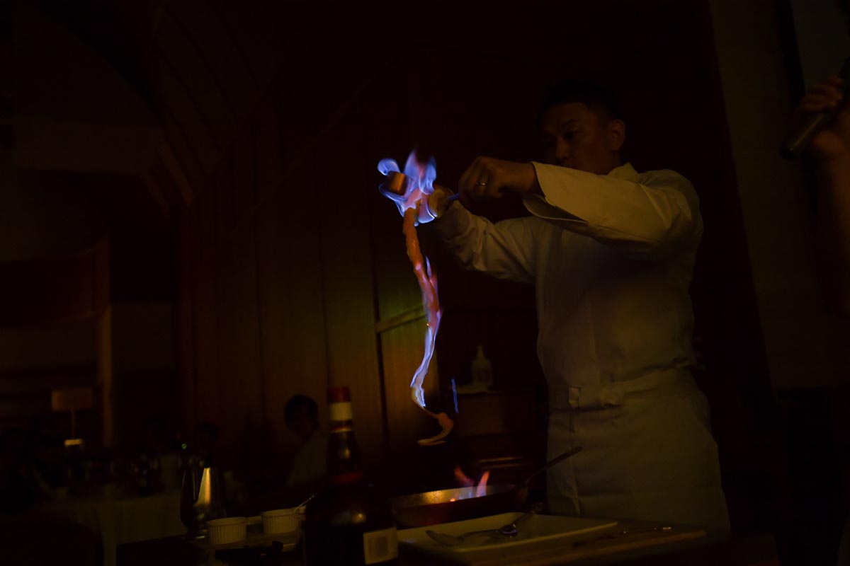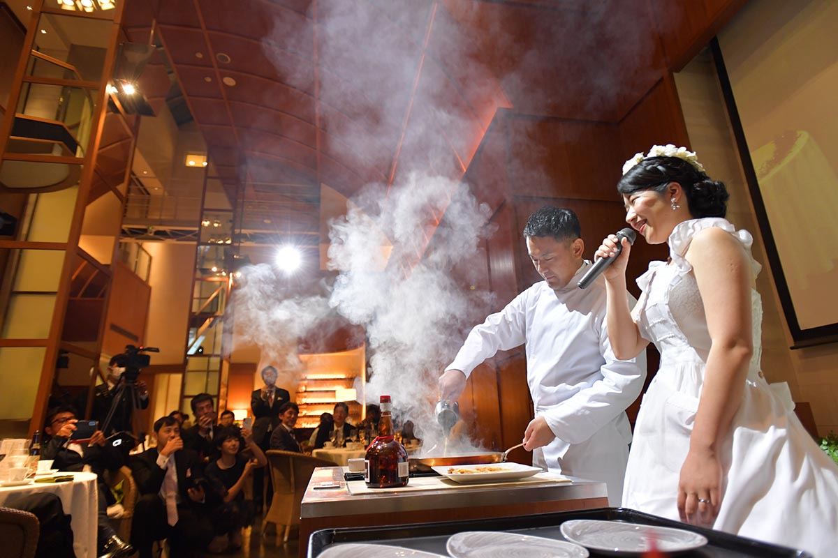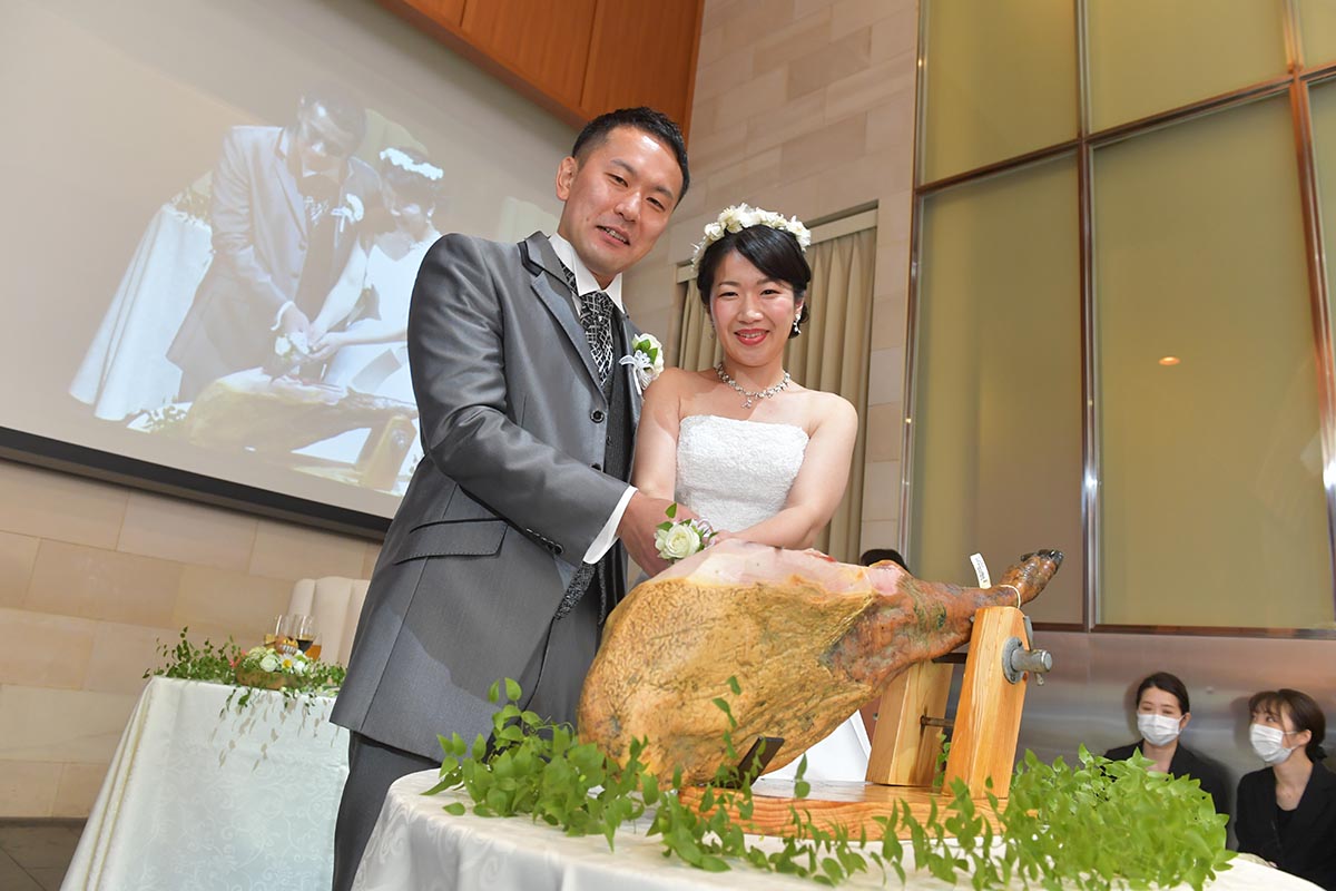 あっと驚いてもらいたくて行ったキッチンオープン、和装であったことに加えお祝い事ということでお願いした獅子舞、ケーキじゃつまらないと生ハムの原木入刀、一番お世話になった新郎のお母さんに感謝を伝えたくて行ったクレープシュゼットと盛りだくさんな内容にしました。