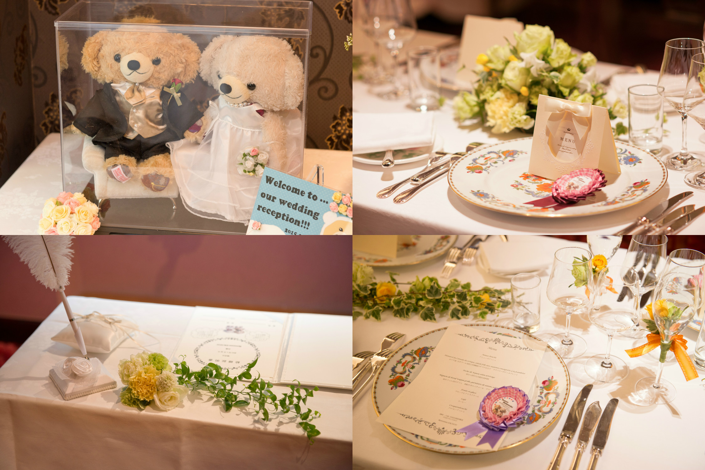 あとは、席札のロゼットやウエルカムベア、ウエルカムボードやメニュー表などを自分で用意したことです。ロゼットは、私が不器用なので業者さんにお願いしましたが、デザインにはこだわって1ヶ月位考えて作ってもらいました。ウエルカムボードやメニュー表なども節約の為に自作しましたが、思い入れができるし、いい思い出にもなりました。
