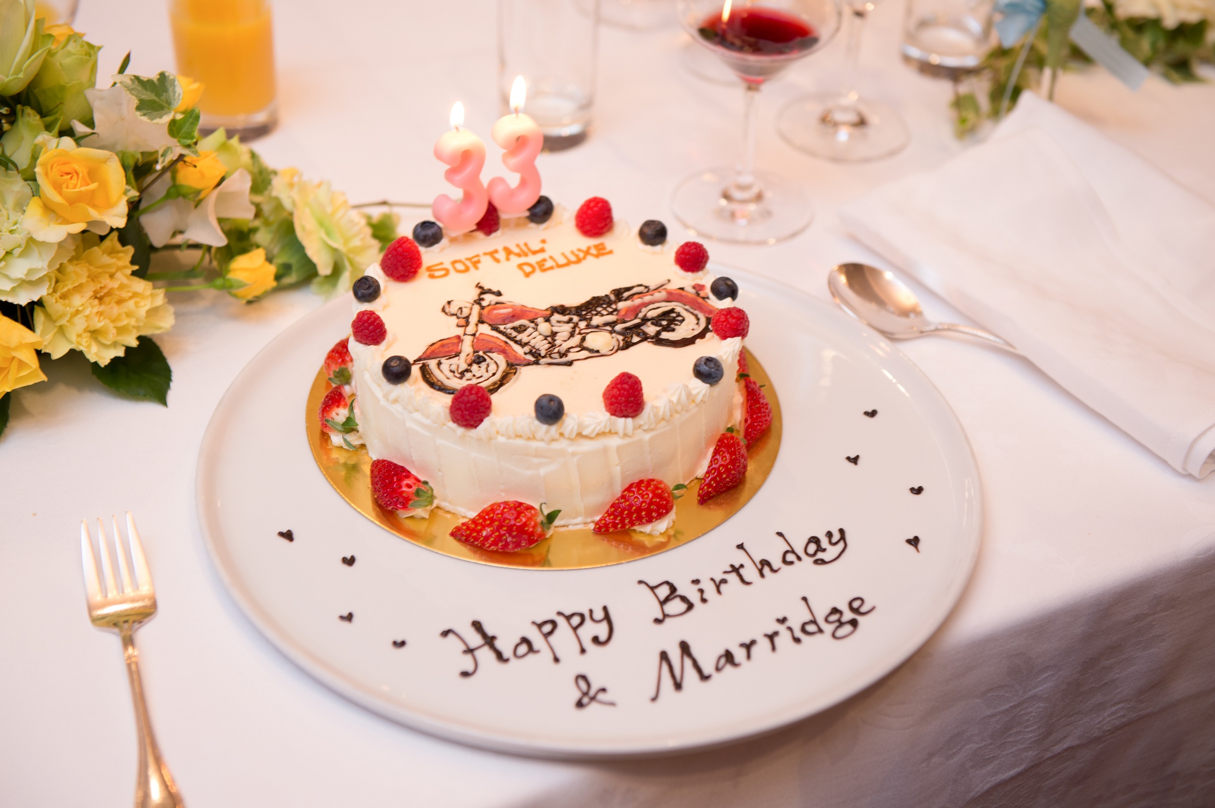 ただ、普通のバースデーケーキだとつまらないので、旦那さんの大好きな愛車のハーレーのイラストを描いてもらうことにしました。結婚式当日のお祝いする時に私も初めて現物を見たのですが、かなり細かいところまで丁寧に描いて下さって、旦那さんはもちろんのこと、親族の小さい子供たちや友人などもすごくテンションが上がって楽しそうにしていたので、パッションさんには感謝するばかりです。