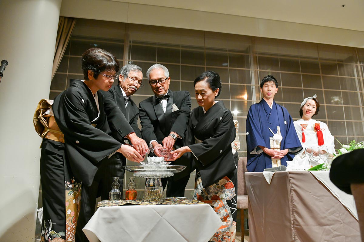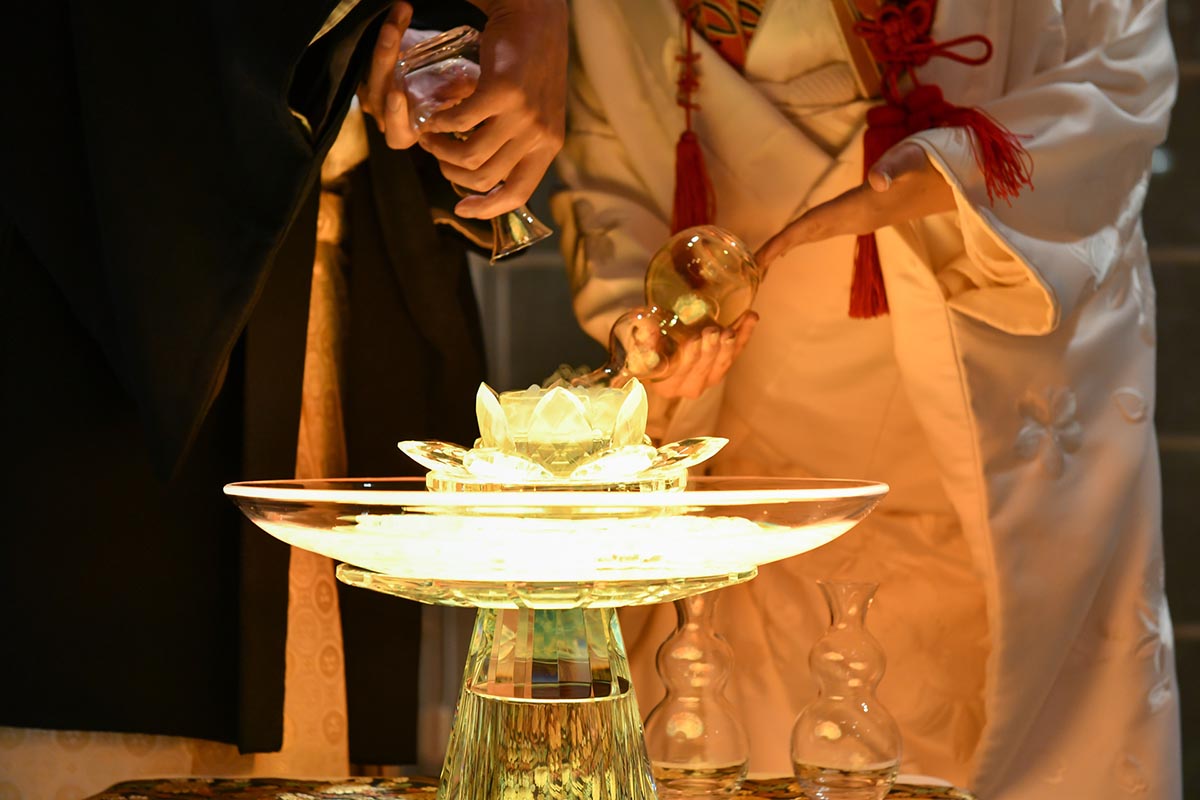 和の演出は入れたかったので、プランナーと話し合い「水あわせの儀」を行いました。両家の結びつきを表すことができ、また両親達にも協力してもらってお水を合わせたのでよりその意味が増したので取り入れてよかったなと思いました。