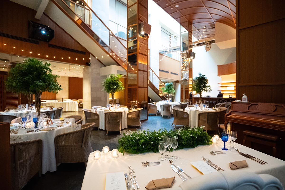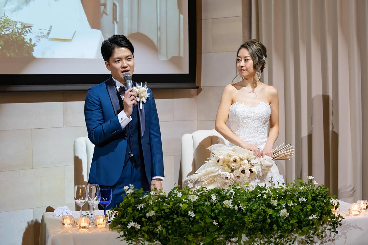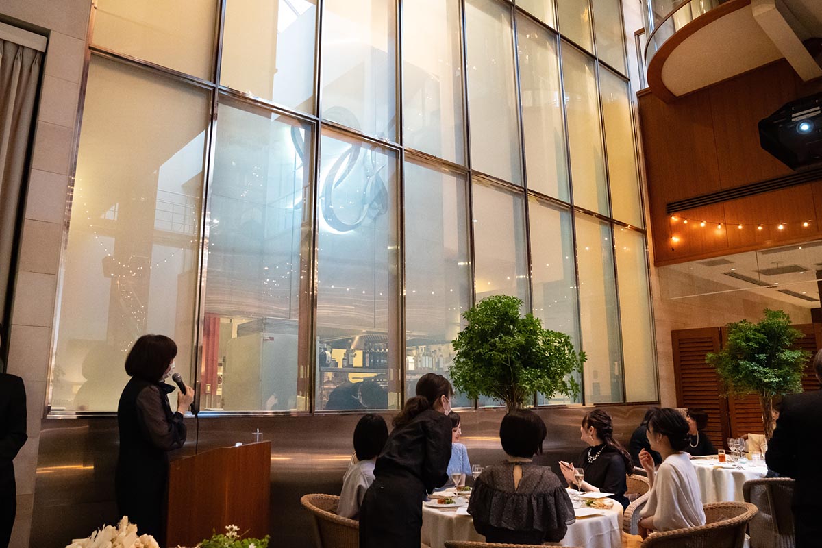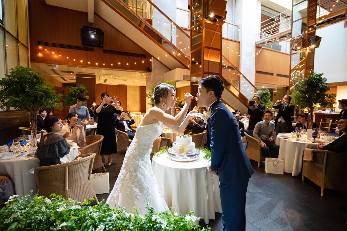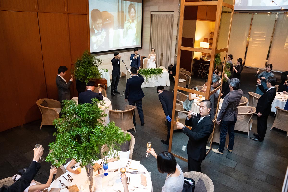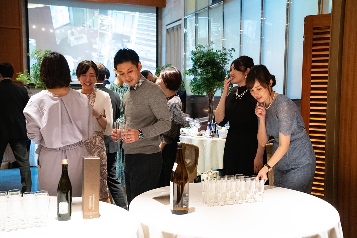 天井が高く開放的な空間やシックな雰囲気などが気に入り、一発で決めました。スタッフの方々が親身に私たちの希望を聞いてくださり、安心してお任せできると感じたことも決め手の一つでした。また、レストランとしても高い評判を見ていましたが、実際に試食させていただき、お料理やワインの味も最高で、ゲストに食べてもらうことがとても楽しみになりました。
