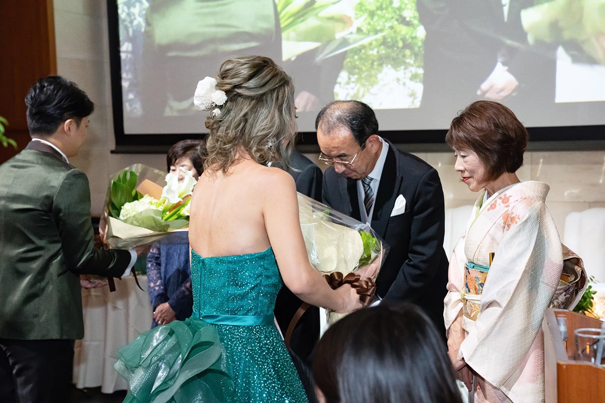 【披露宴会場の装飾】アットホームな空間を意識し、ガーデンウエディングのようなカジュアルな雰囲気を演出したかったので、ゲストテーブルには木、天井にはストリングライトを飾り、披露宴会場を森の中のパーティーのよう創っていただきました。【披露宴の演出】家族やゲストと一緒にゆっくり時間を過ごしたかったので、余興はなしにして、新郎新婦からのゲスト紹介や写真撮影、歓談の時間を多く取りました。両親かゲストへの感謝のしるしとして日本酒を差し入れてくれたので、日本酒バーコーナーを設け、両親がゲストにお酒を振る舞うなど、家族とゲストが交流をしながら自由に楽しんでもらえる工夫をしました。また、両親への手紙を新郎も読んだり、ファーストバイトの際にゲストへのサンクスバイトを行ったり、家族や大切な友人に少しでも感謝が伝えられるような場面を増やしました。