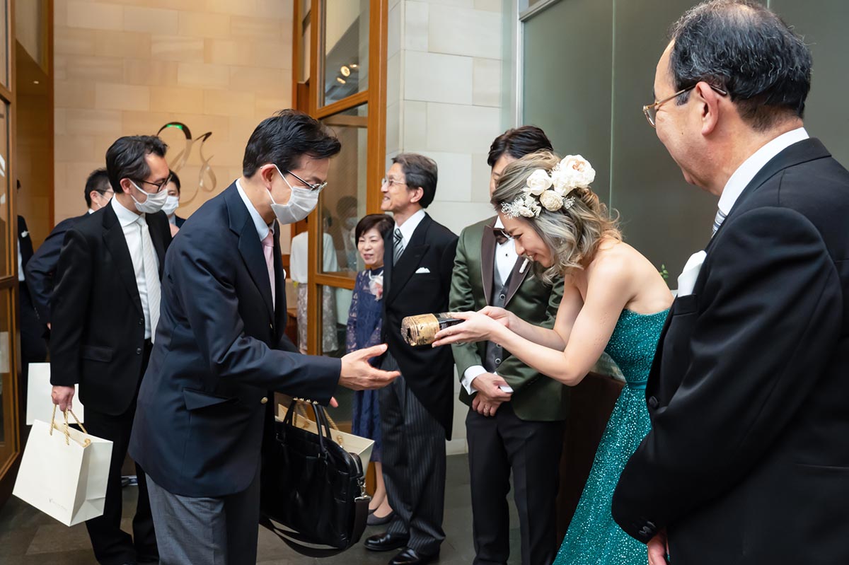 お料理のコースはいくつかあったのですが、事前にゲストが好きな方を選択できるグルマンコースを選びました。ゲストの好みを少しでも反映できたことが嬉しかったですし、私たち自身も事前にお料理が選べる結婚式は初めてだったので、当日がとても楽しみでした。実際に試食させていただいて、お料理が素晴らしいことはもちろんですが、お料理に合わせて出てくるワインがとても美味しかったことに感激しました。あまりに気に入ったので、後日同じワインを自宅でも購入して飲みましたが、ワインの味を引き出せるのは美味しいお料理があってこそだと実感しました。私たちは披露宴中にお料理を食べる時間があまりなかったのですが、終宴後に控室にお料理をご用意いただけたことに、スタッフの方々の温かさを感じました。