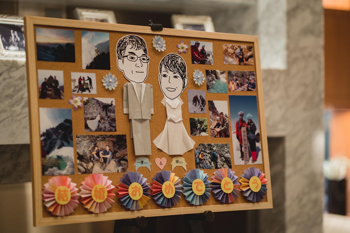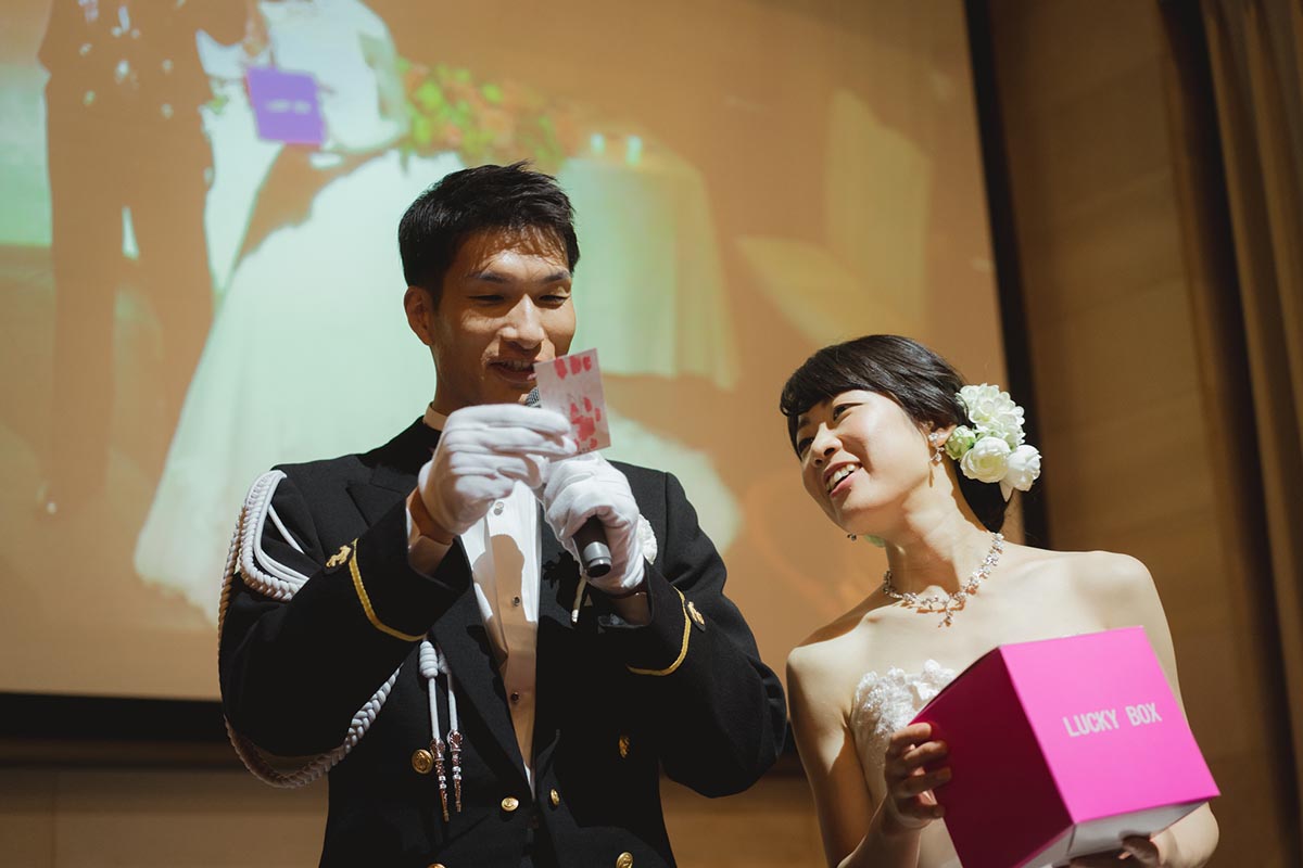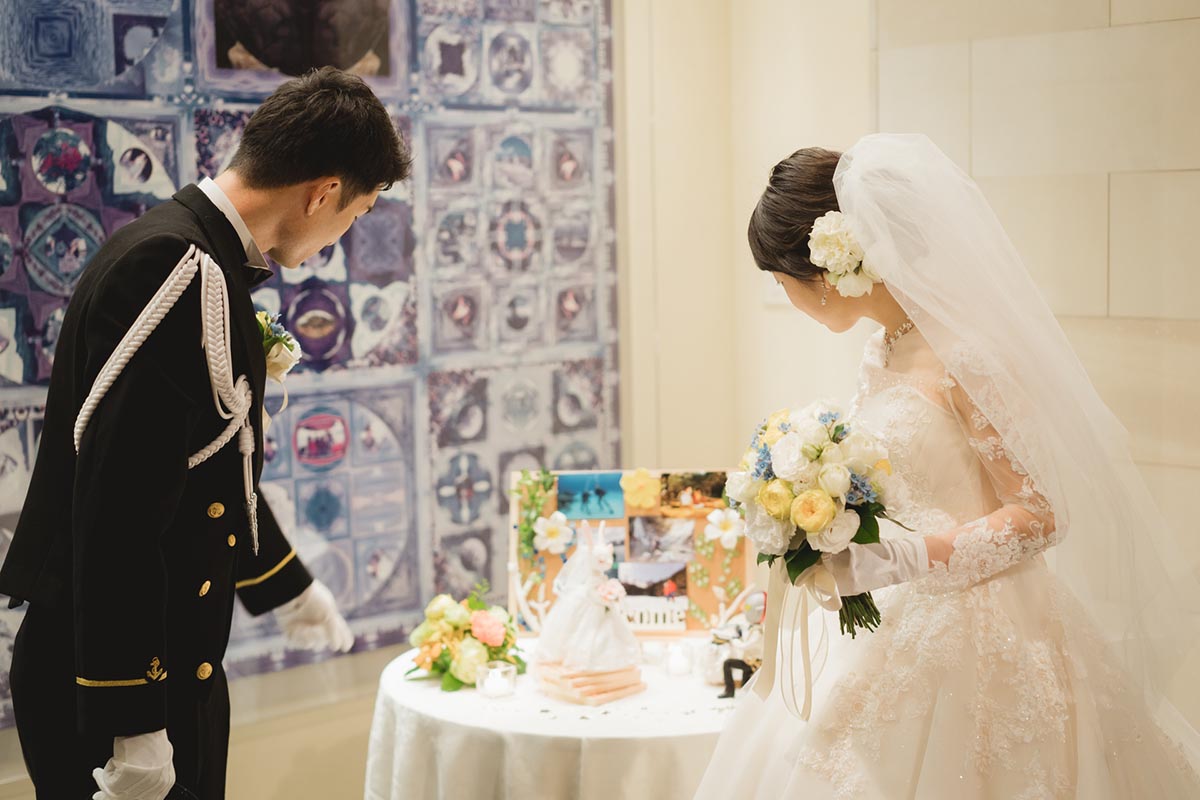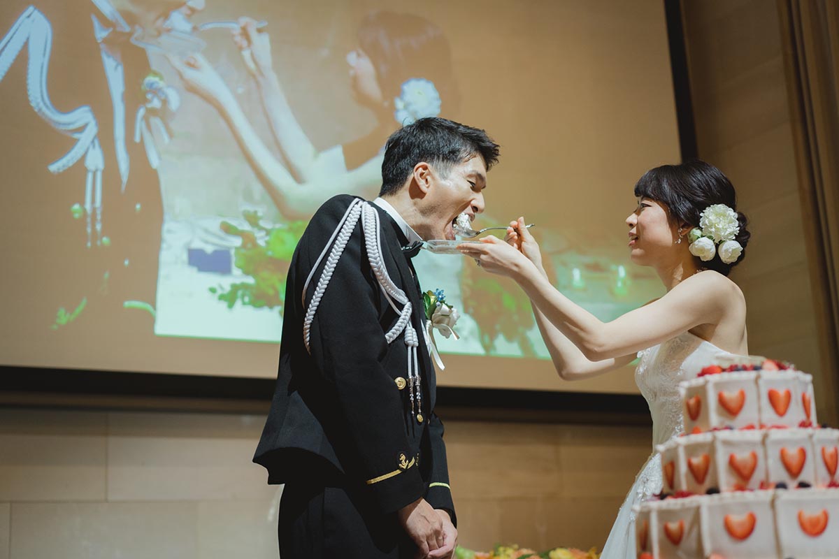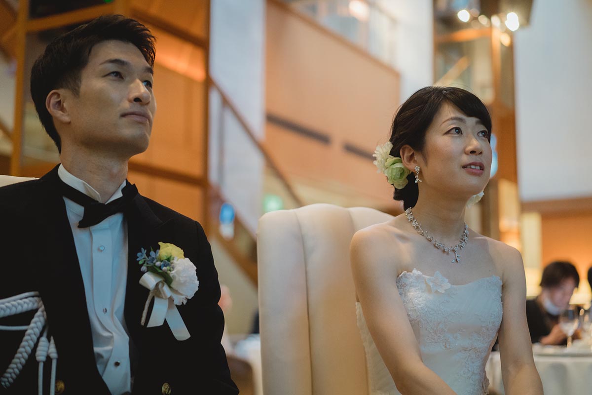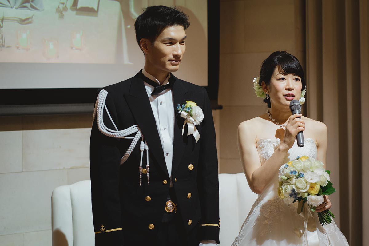 結婚式をすでに経験している既婚の方、複数回出席したことのある方が多かった為、想像されている演出とはちょっと違う印象に残る結婚式となるように工夫しました。プロフィール紹介も司会の方に読んでいただいたり、ただ動画を流すタイプではなく、パワーポイントで作った自己紹介の画像を映し出し、それに対して1ページずつ自分で説明していくプレゼンタイプにさせて頂きました。自分自身で説明するため、特に思い入れのある出来事や、ご主席頂いている皆さんとの思い出など、特に強調したい部分は心を込めて説明することができたと思います。また、式の前に離島に引っ越してしまったため、私たちが今住んでいる島の様子も知ってもらいたいと思いました。島で撮影した前撮り写真で作った動画、島で調達した食材での特別メニュー、島の特産品のお土産等いろいろ用意させて頂きました。