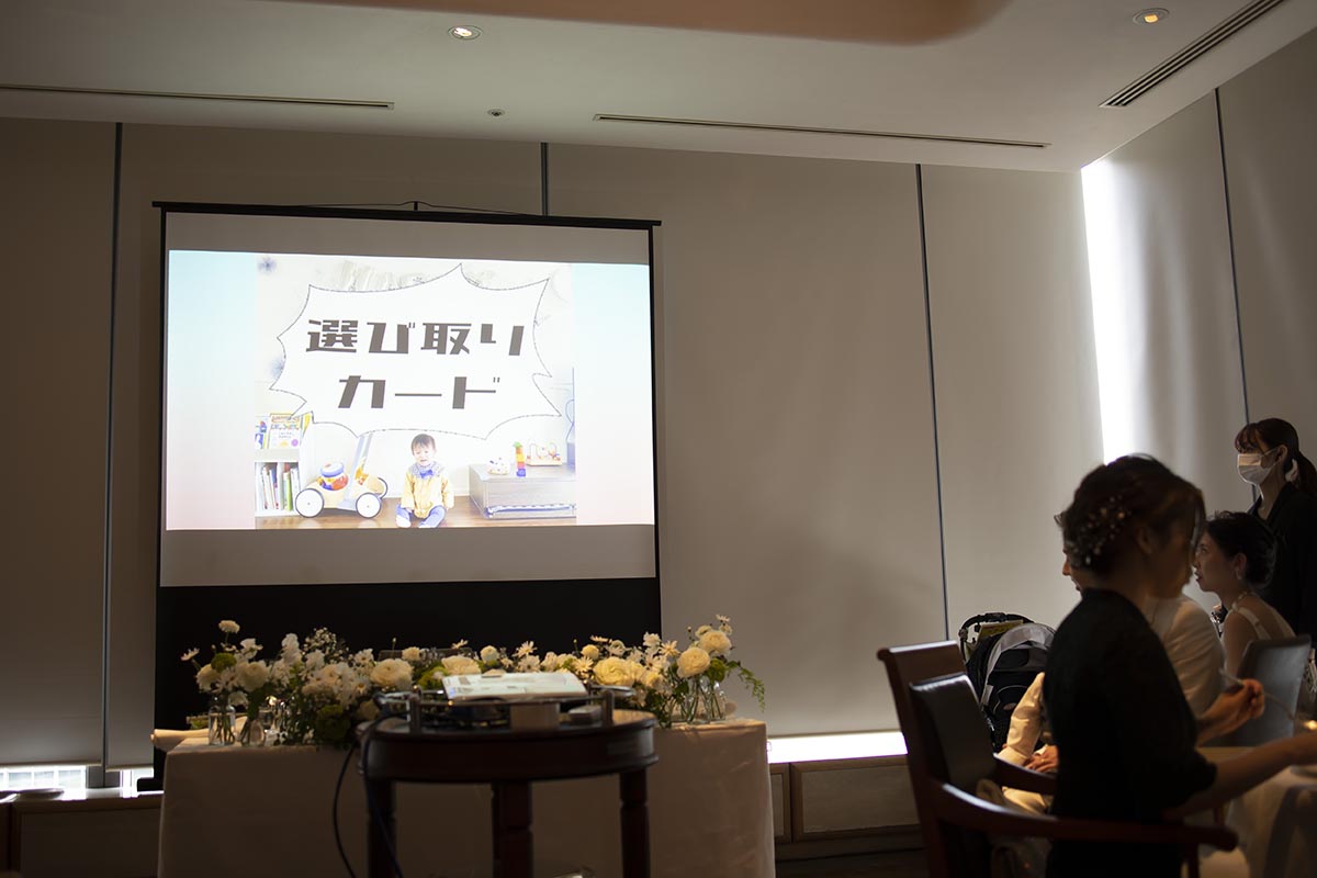 余興は規模が小さいので用意するか迷いましたが、親族間の会話の種が一つでも多くあった方が良いかもと思い「子どものバースデー記念ムービー」と「選び取りカード当てクイズ」を用意しました。