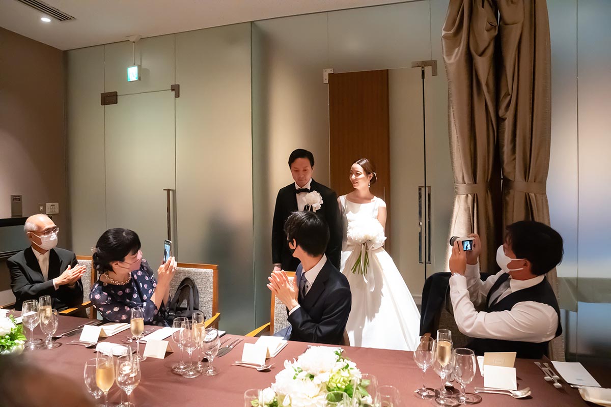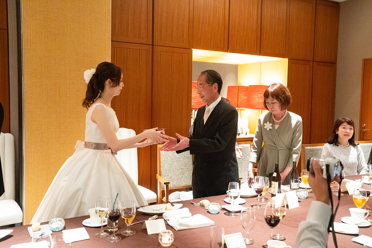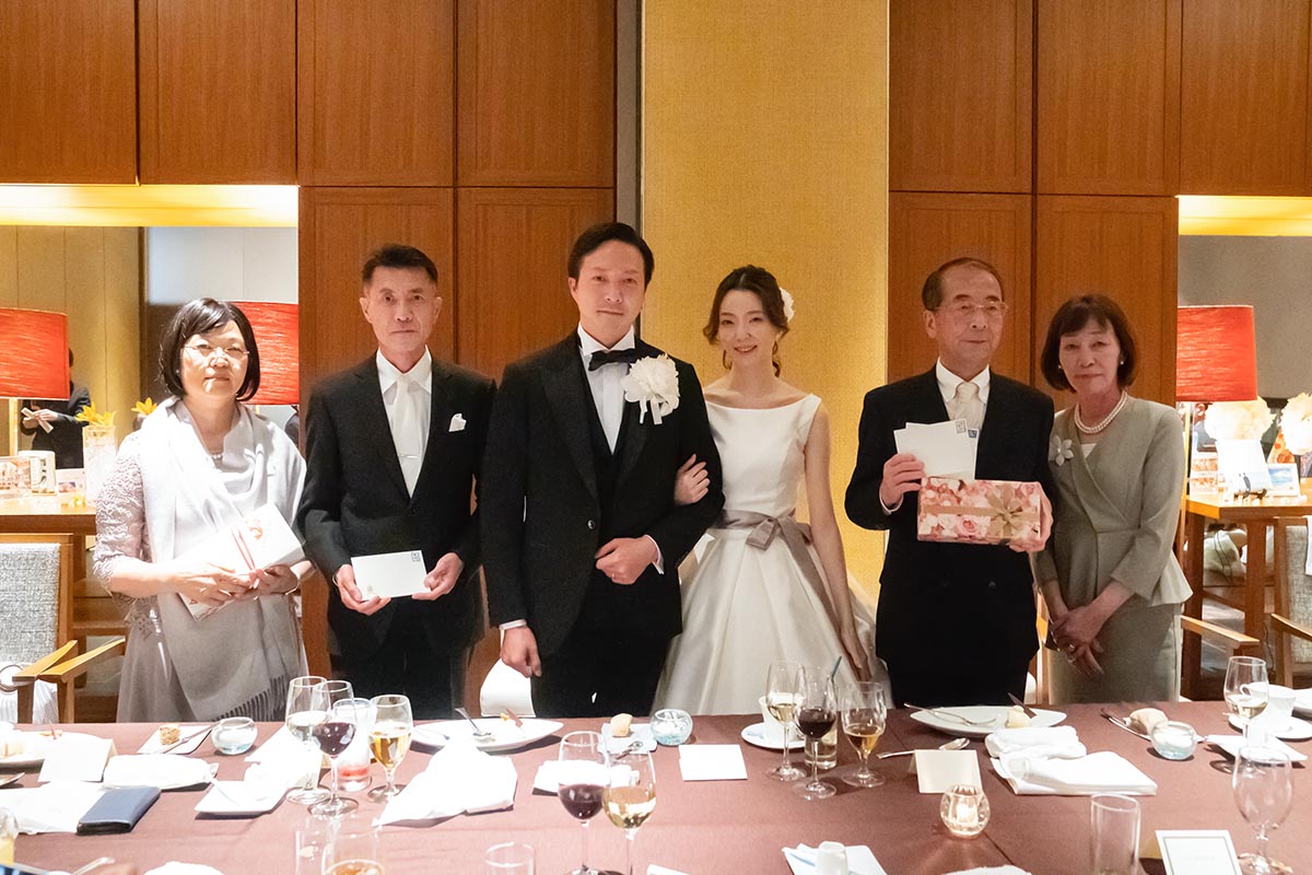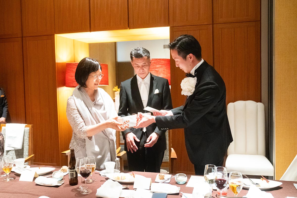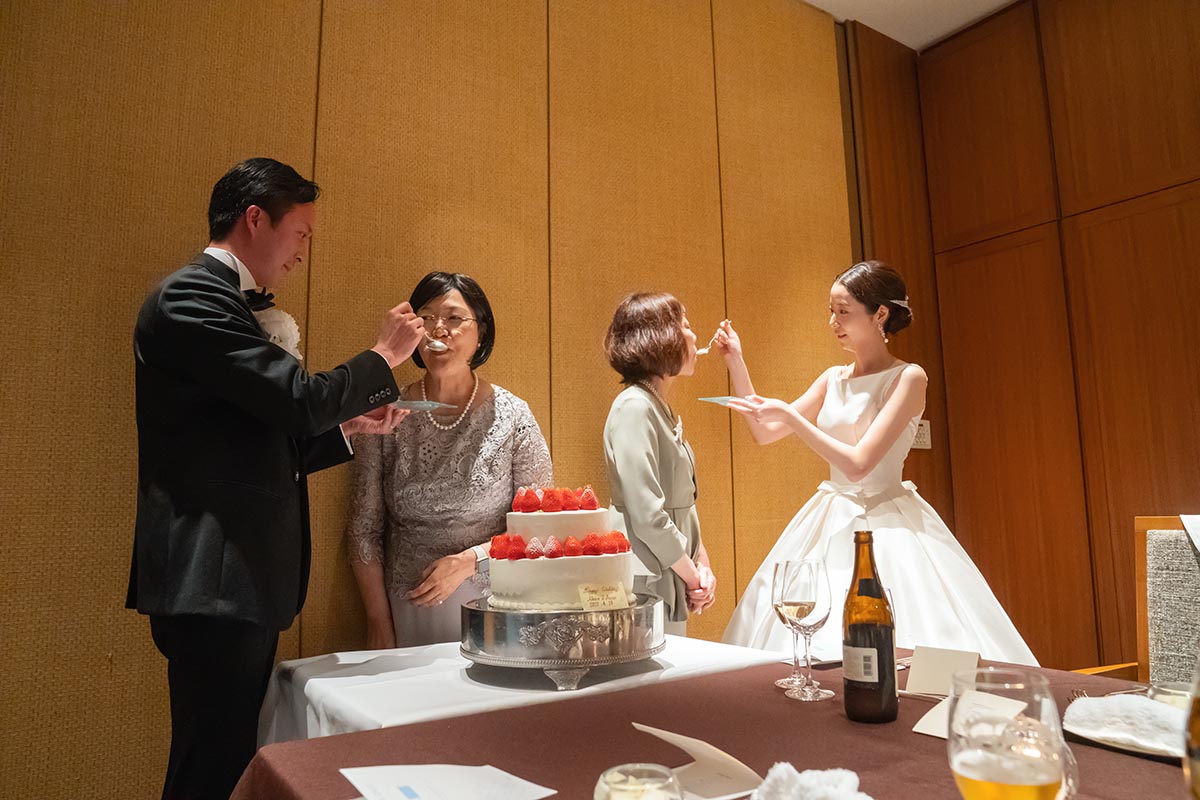 親族だけでの会食だった為、ゆっくりとお食事を楽しんでもらいたかったので特別な演出などはありませんでしたが、親族紹介やケーキ入刀、両親へのプレゼントなどを食事の合間に盛り込んでいただきました。ケーキ入刀では、お母さんへのサンクスバイトも喜んでもらえました。