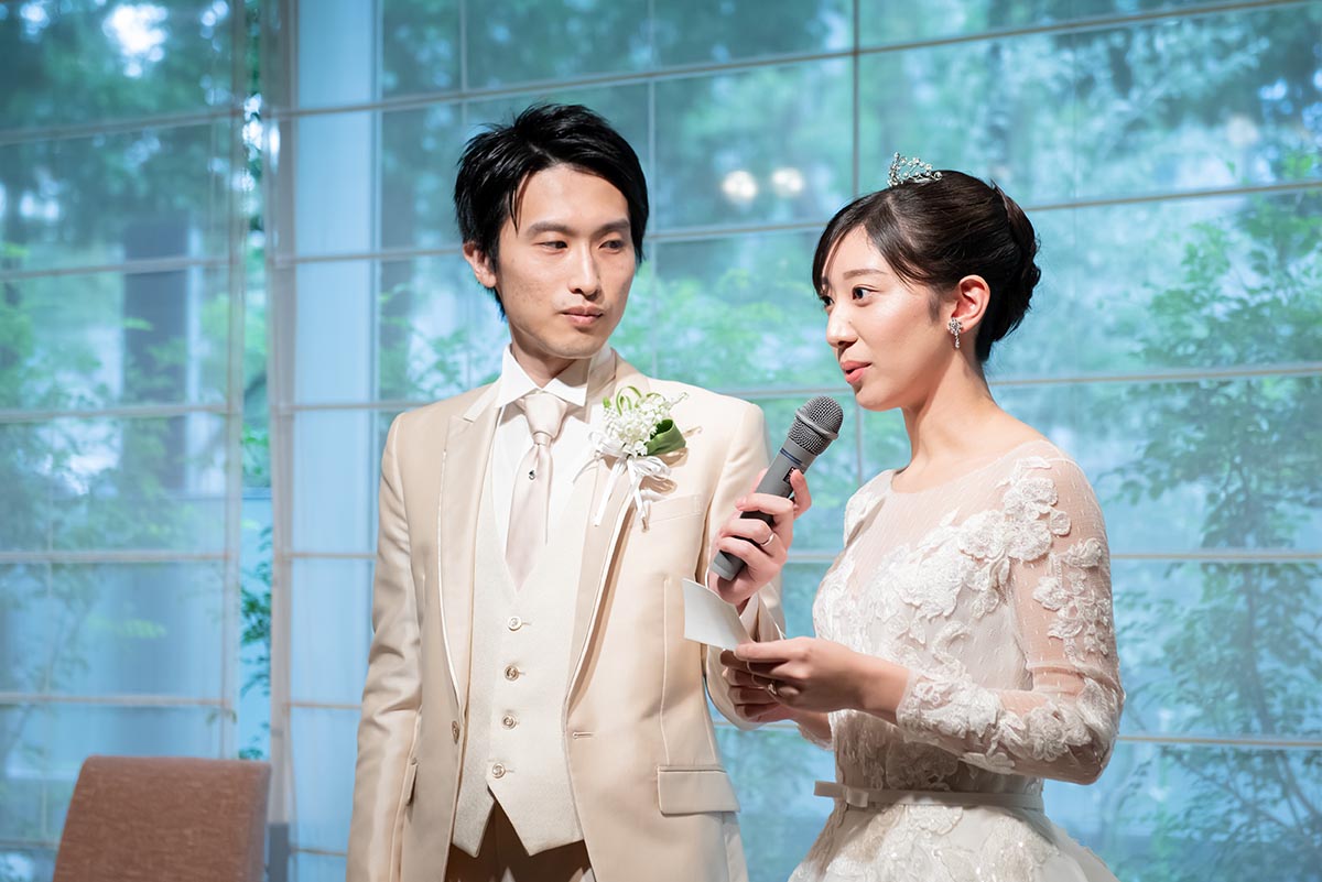 ゲスト参加型のイベントを実施したことと歓談の時間を多く設けたことです。受付でチケットの半券を箱に入れて、式中に新郎新婦が当たりくじを発表、当選者に賞品を渡すのと引き換えに一言メッセージをお願いしました。くじ引き自体も盛り上がりましたが、司会者の方のうまい進行のおかげで一言メッセージについても大変盛り上がり、実施してよかったなと思いました。テーブルラウンドは実施せず、高砂での歓談をメインに行ったため、久しぶりに会うゲストの方ともゆったりとした時間をすごすことができました。また、写真もたくさん撮ることができました。ゆとりをもって披露宴を楽しむことができたと思います。