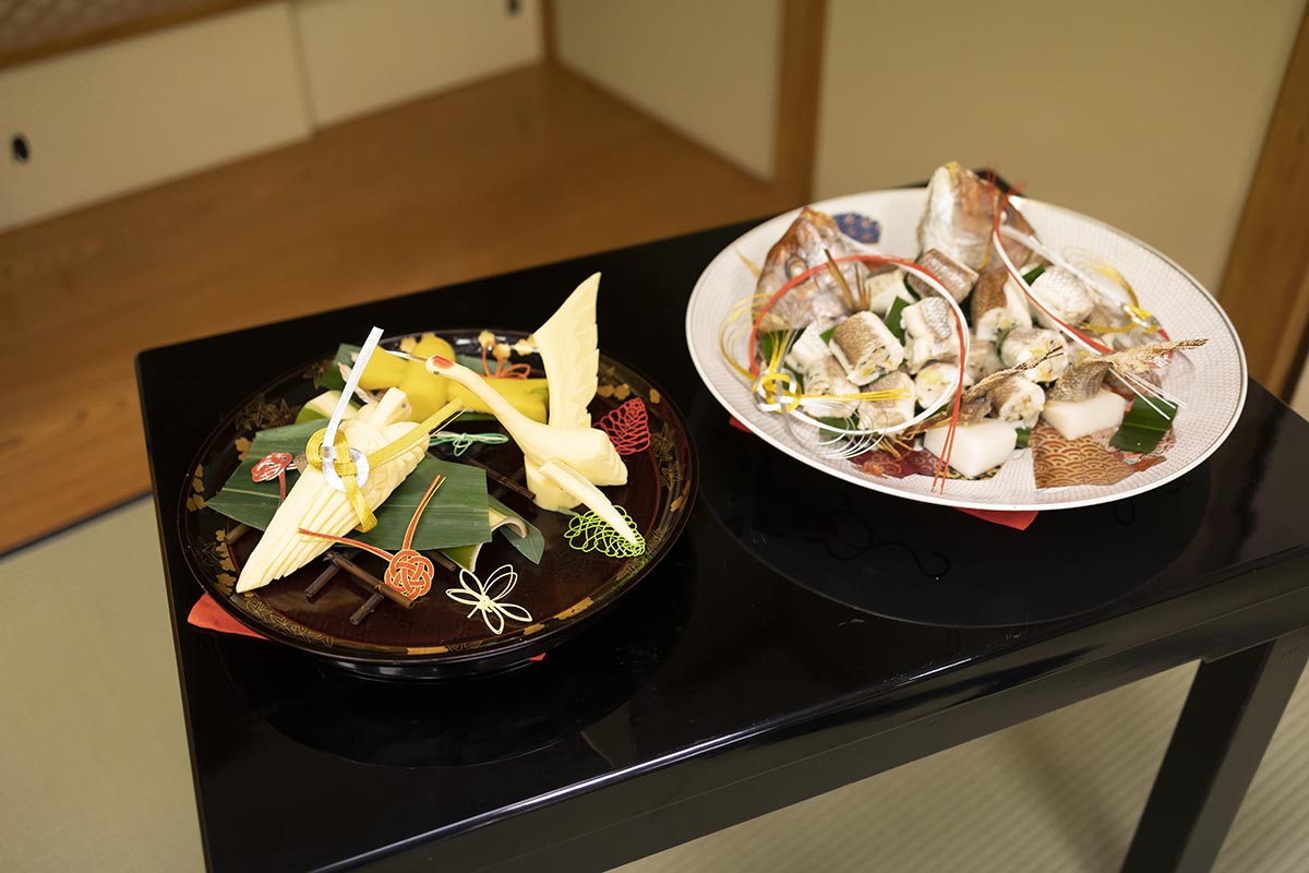 当日、会場に調理前の材料を使った縁起の良い鶴や亀などが飾られていたのにも感動しました。
