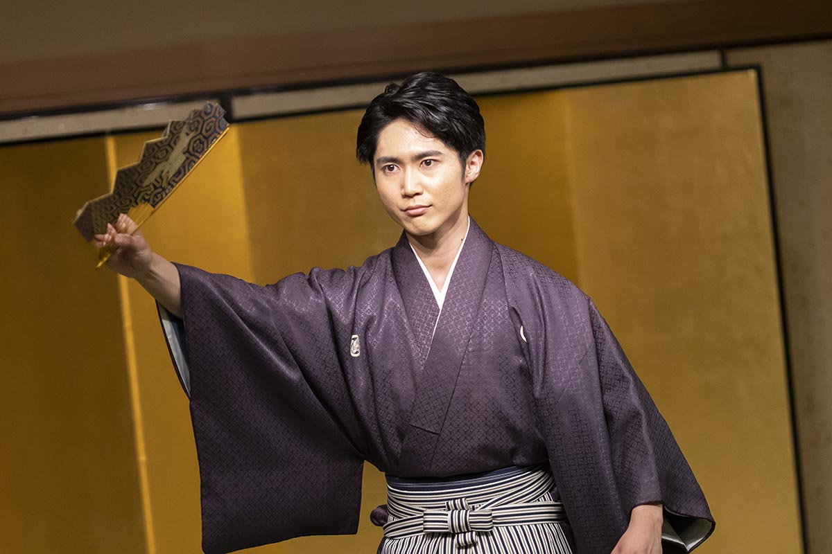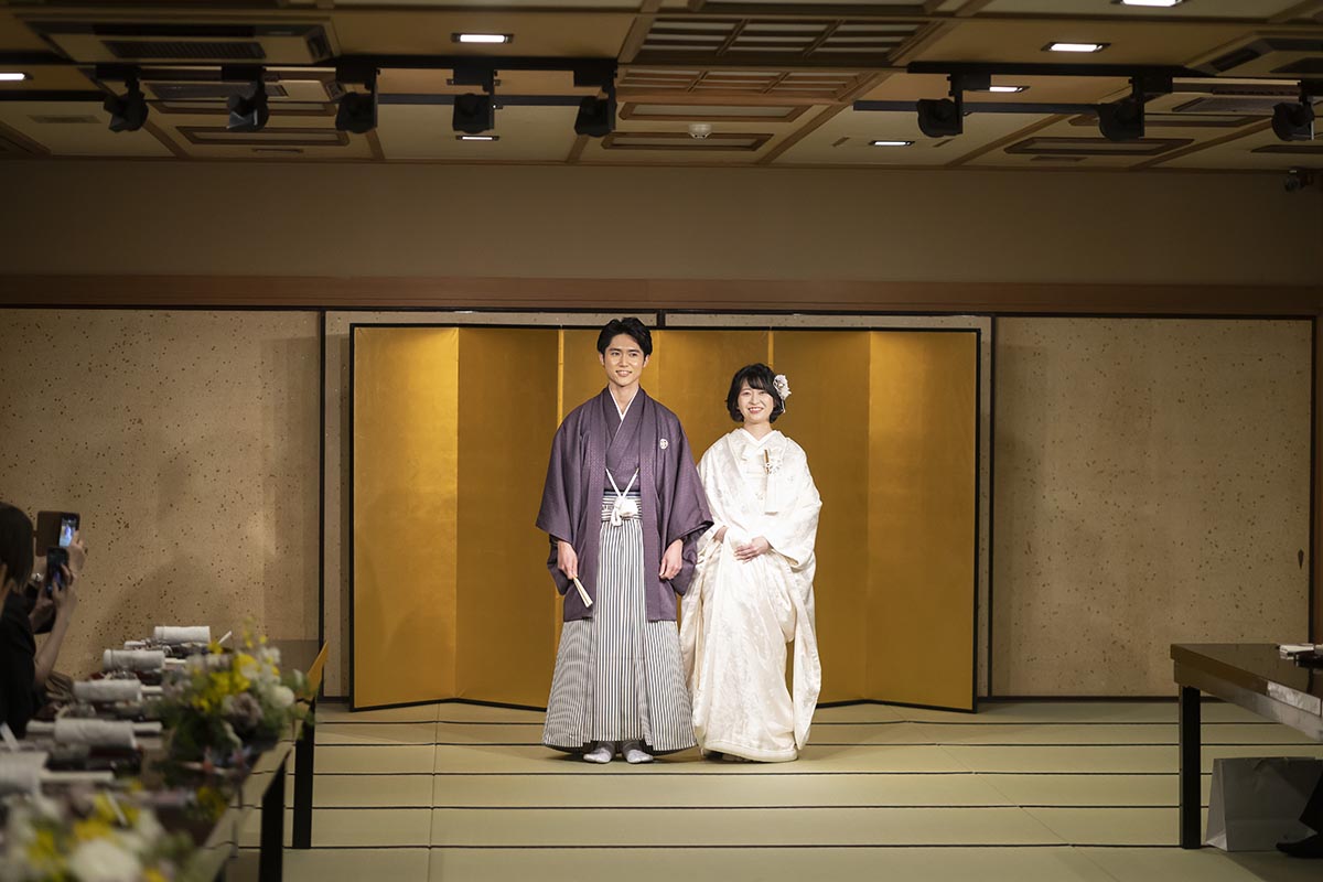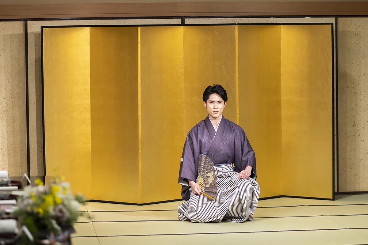 まず新郎が、趣味の能を披露。披露宴を華やかかつ厳かな雰囲気で開始するとともに、私たちの末永い結婚生活と、ゲストの方々のご多幸を祈るという気持ちを込めて、“高砂”というおめでたい演目を舞いました。