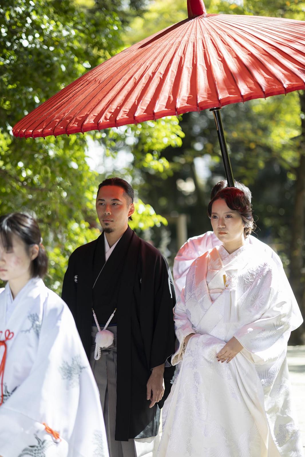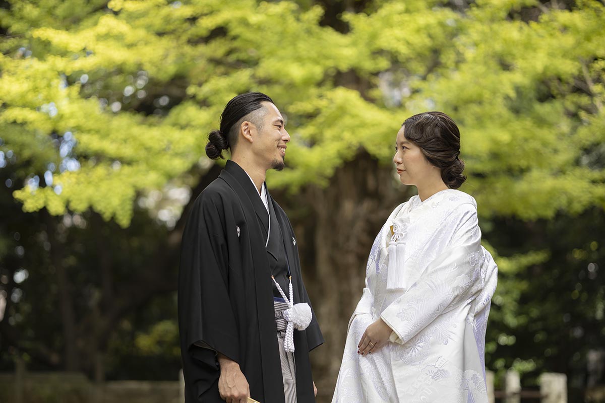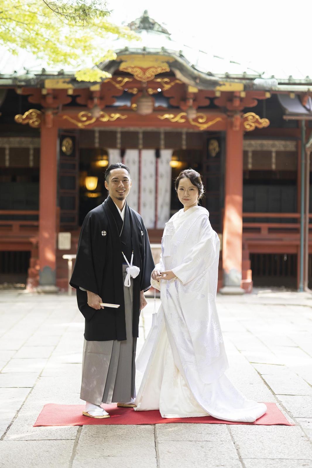 赤坂氷川神社:鮮やかな朱塗りと経年変化で緑になった屋根、美しい天井絵の社殿を見た瞬間、ここだ!と思いました。坂の上にあり緑に囲まれた境内は、都内にあるとは思えないほど静かで厳かで、私たちの思っていた神前式のイメージにぴったりでした。また、説明会も丁寧で詳しく、当日のイメージが湧きやすかったのもポイントでした。