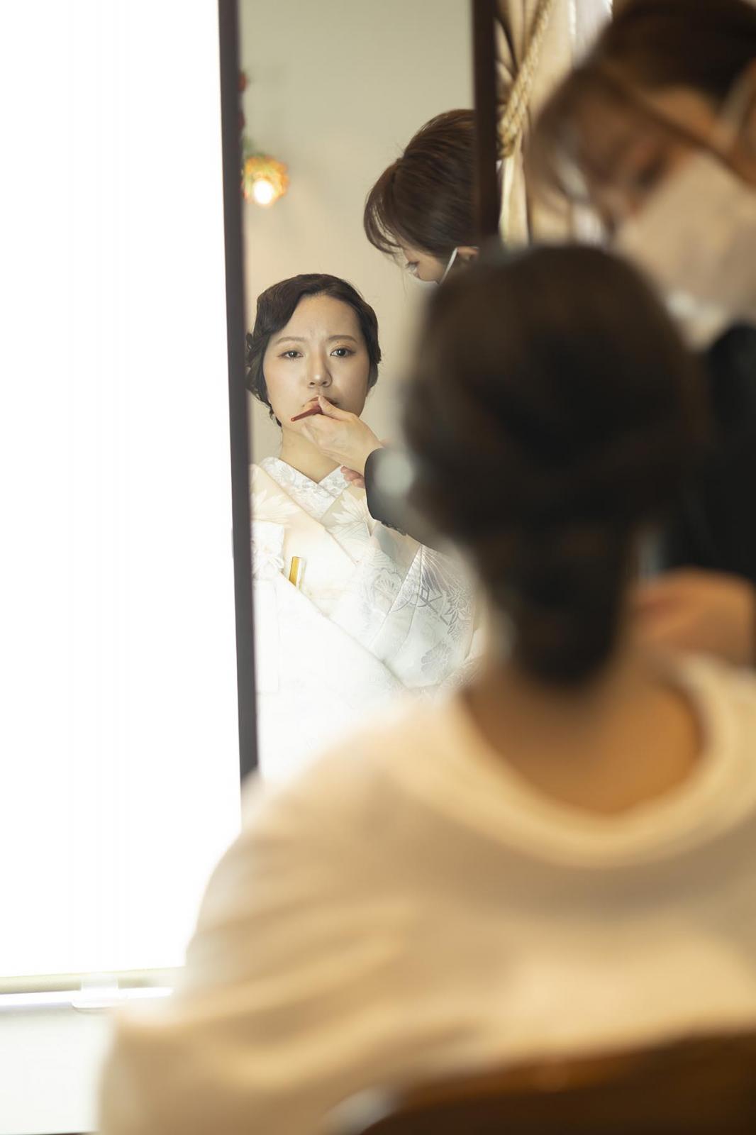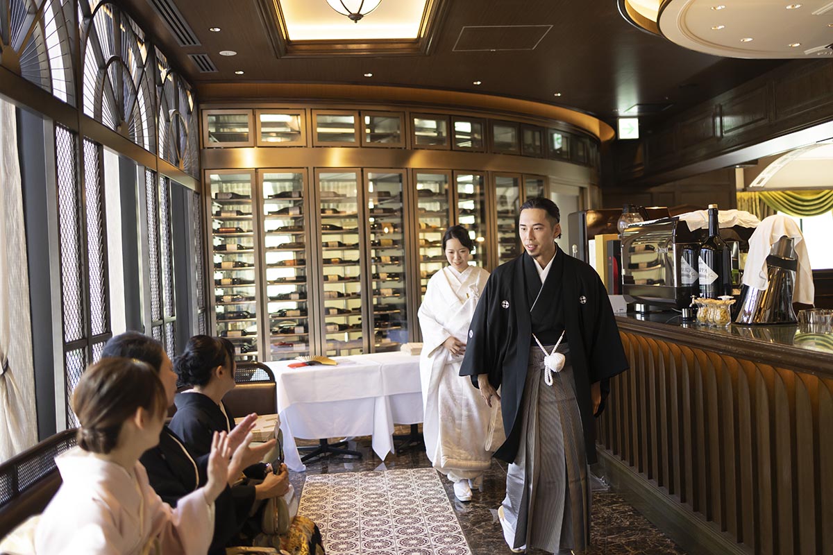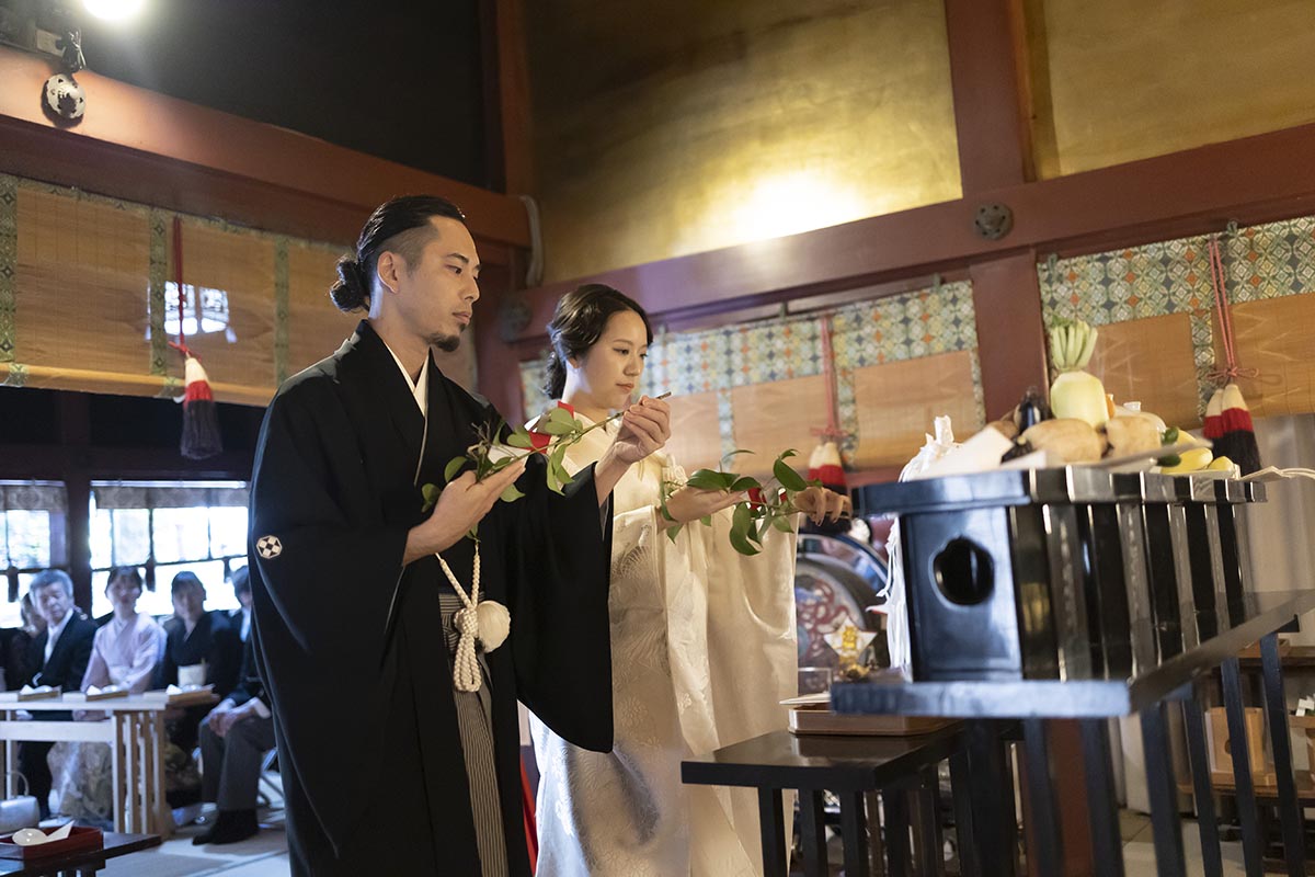 赤坂氷川神社:鮮やかな朱塗りと経年変化で緑になった屋根、美しい天井絵の社殿を見た瞬間、ここだ!と思いました。坂の上にあり緑に囲まれた境内は、都内にあるとは思えないほど静かで厳かで、私たちの思っていた神前式のイメージにぴったりでした。また、説明会も丁寧で詳しく、当日のイメージが湧きやすかったのもポイントでした。