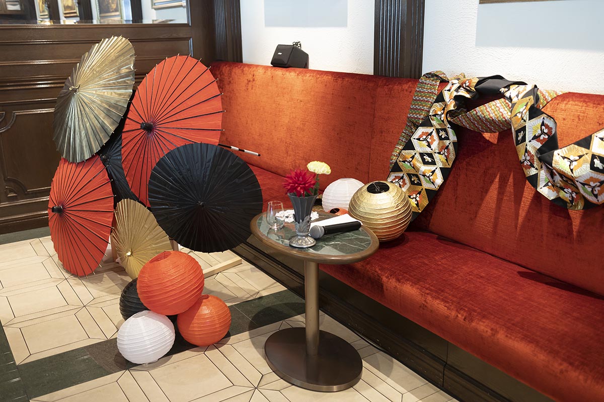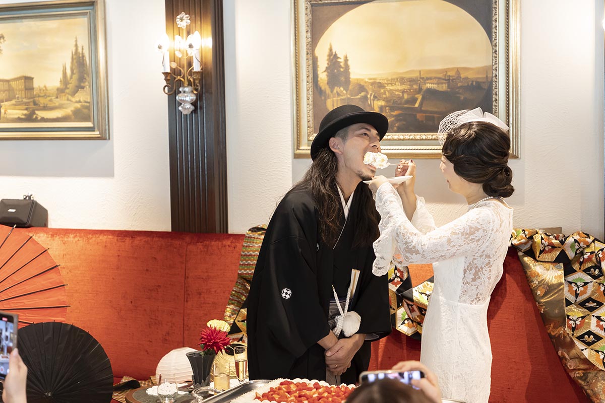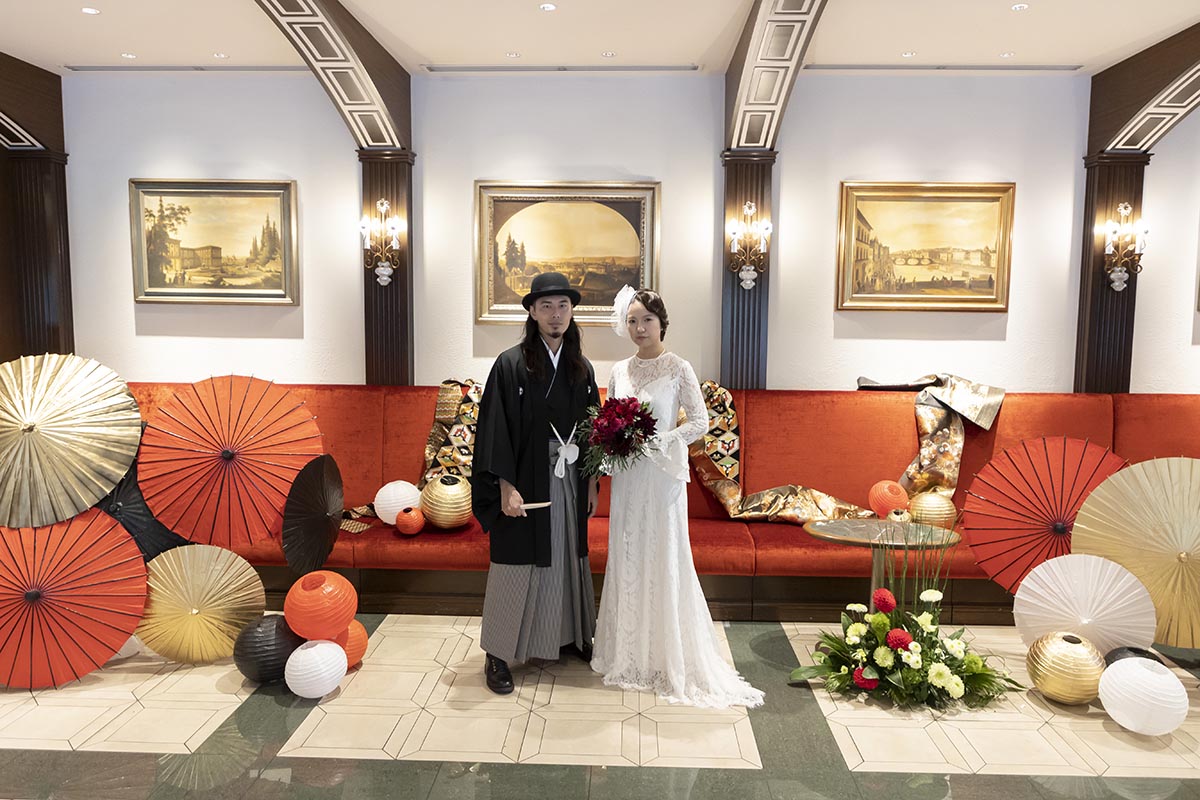 新郎が袴だったこともあり、和傘や着物の帯を使って会場内を和風に装飾しました。装花もダリアをメインにしてもらいました。和洋折衷感が、大正ロマンをより演出できてゲストからも好評でした。