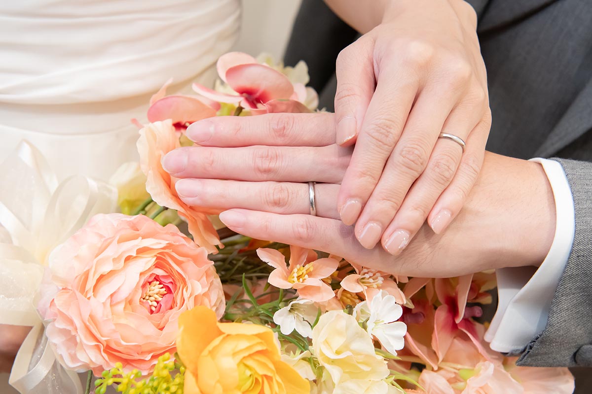 披露宴ではなく、家族のみの会食とすることにしました。チャペルのこだわりポイントはお花です。祭壇には白とグリーンを基調にしたナチュラルな雰囲気のお花を取り入れ、チェアフラワーの代わりとして、椅子の脚元に種類の異なる花を一輪ずつ小さな花瓶に入れて並べてもらいました。ブーケ&ブートニアはアートフラワーで作製していただき、挙式後も自宅で飾れるようにしています。 また、挙式に使う小物は手作りにこだわり、リングピローは新郎が、ウェルカムボードは新婦の手描きで作製しました。