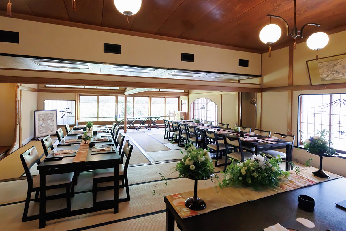 式と同様、食事会も純和風にしようと思っていたので、プランナーさんに湯島天神から近い和食のお店をいくつか紹介してもらいました。その中で、老舗の「茶寮一松」さんはお料理はもちろん、店内のつくりもとても素敵で、私がイメージしている少し古風な日本の式にピッタリだと思いました。こちらは昭和27年に開業した歴史あるお店で、有形文化財にも登録されています。お借りした会場は「富士」だったと思います。窓辺に富士の透かし彫りがあり、美しい調度品があるお部屋でした。お料理は和食のコースで、見た目も美しく美味しかったです。列席した皆さんからも大変好評でした。