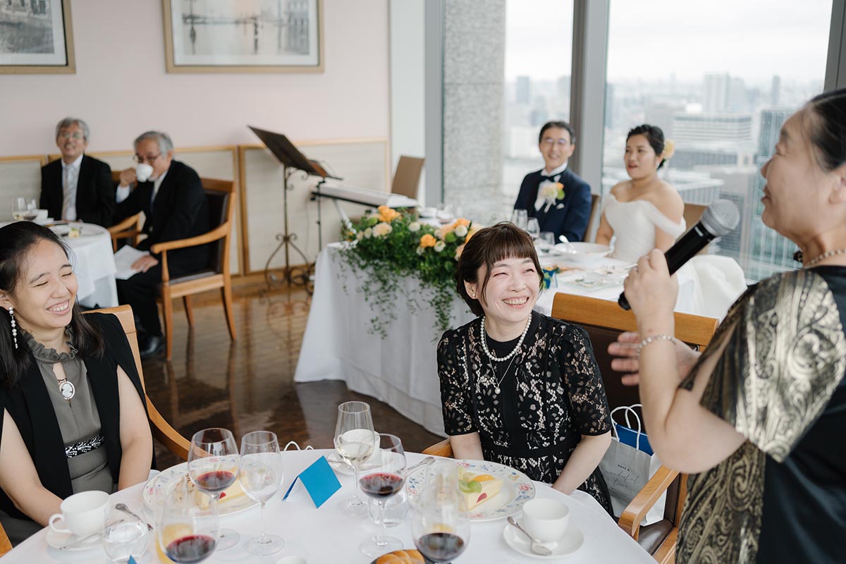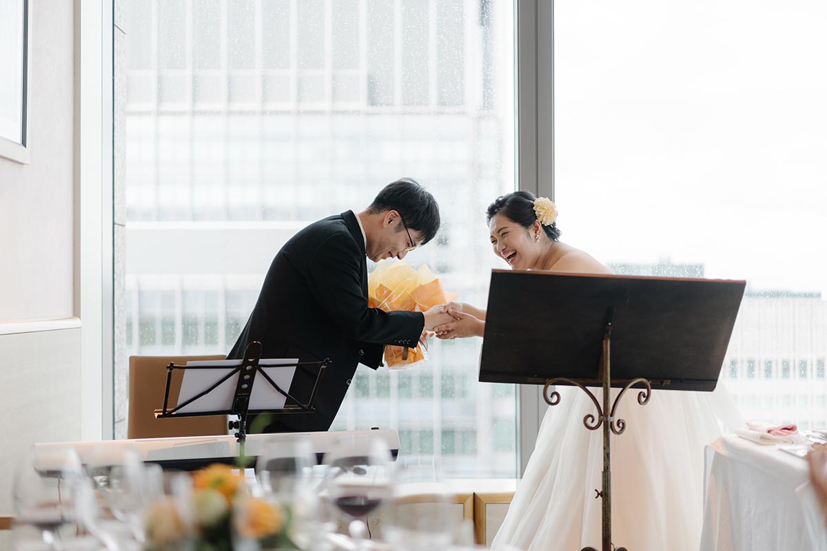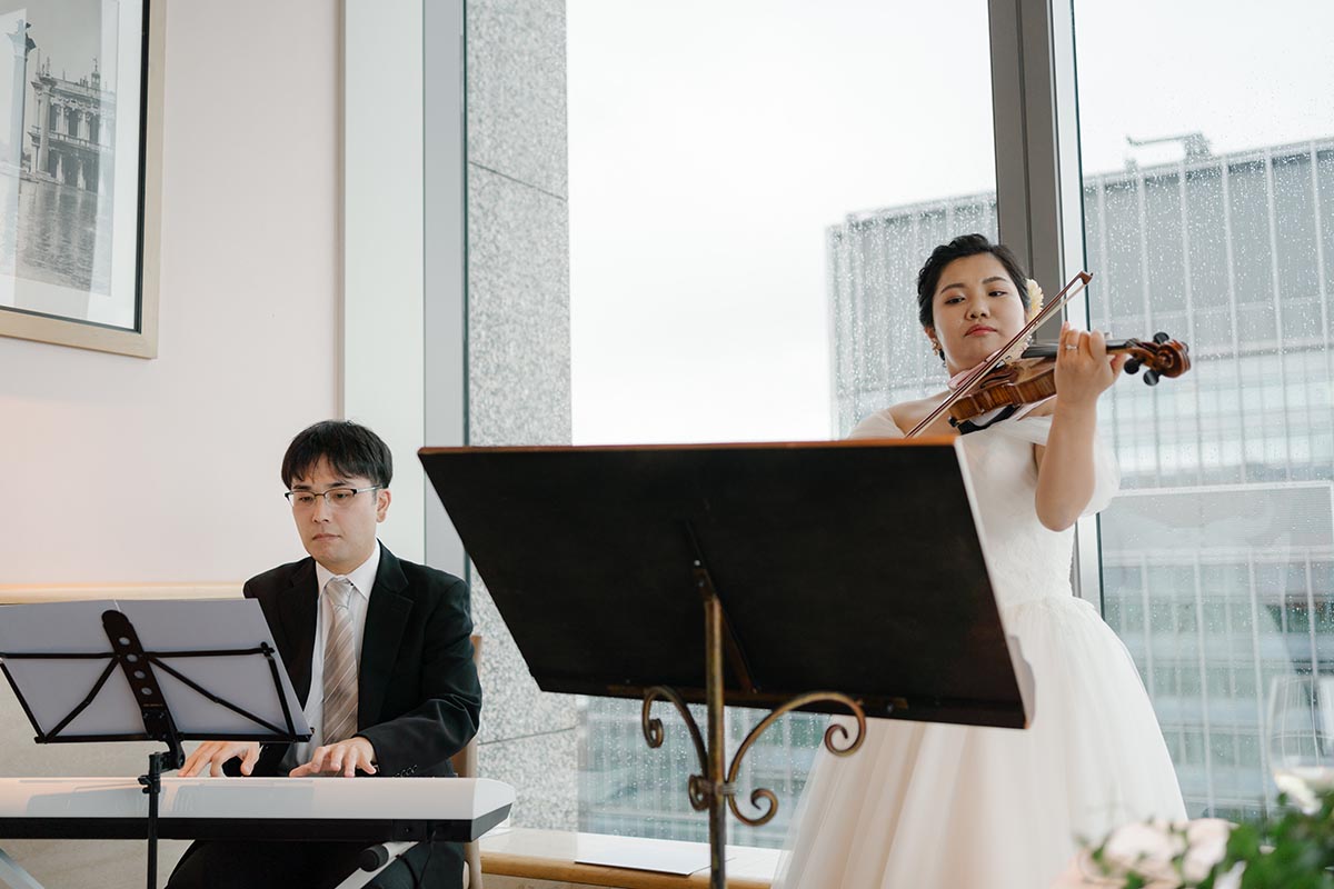 近しい人たちと、アットホームに美味しいものを囲んで楽しむことが何よりでしたので、ゲストとの会話やこれまでの思い出を振り返る時間をメインに、テーブルラウンドやゲストへの思い出インタビューに時間を割きました。また、プロフィールムービーは、新郎新婦の自己紹介というよりも、ゲストとのこれまでの思い出を紹介する内容にしました。唯一の余興は新婦による楽器演奏でしたが、幼少の頃から習っている恩師の前で披露することとなり、緊張すると同時に、これまでの成長を見せることができてよかったのではないかと思いました。