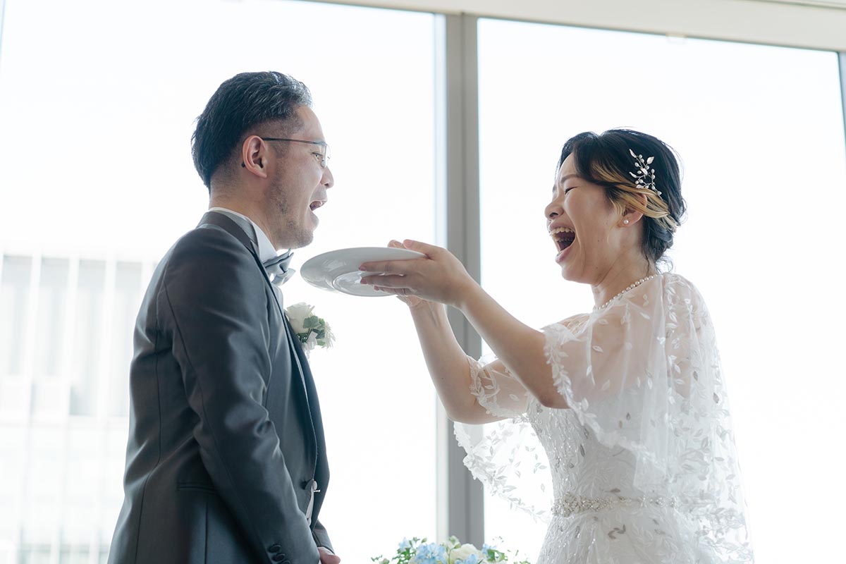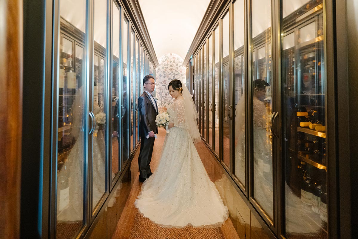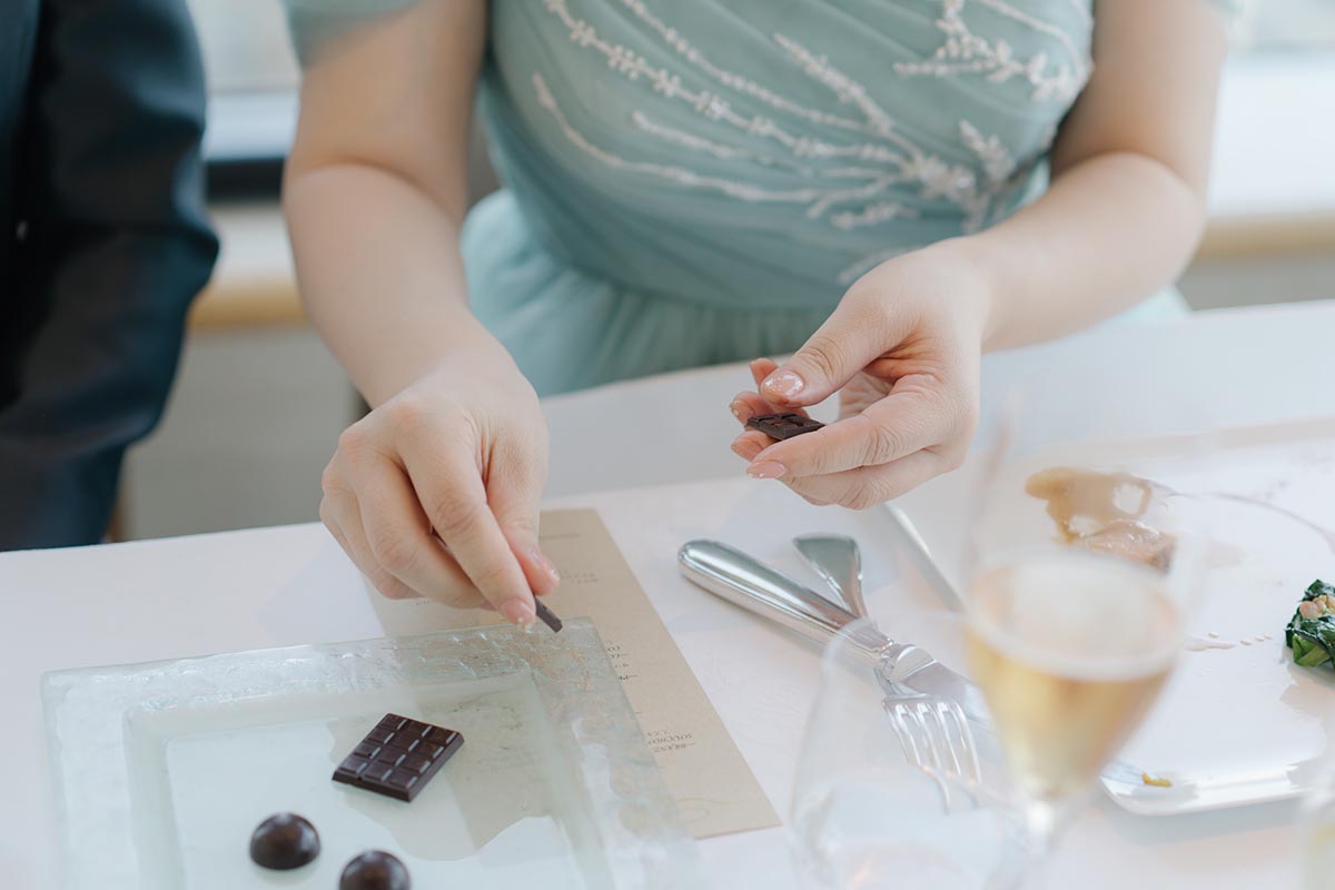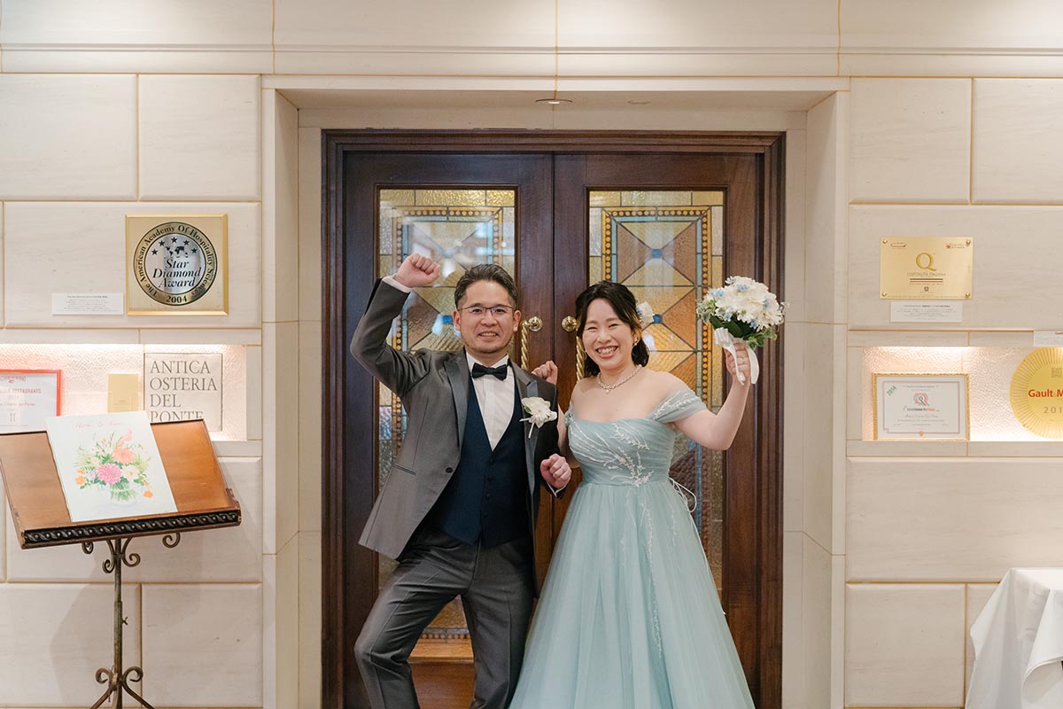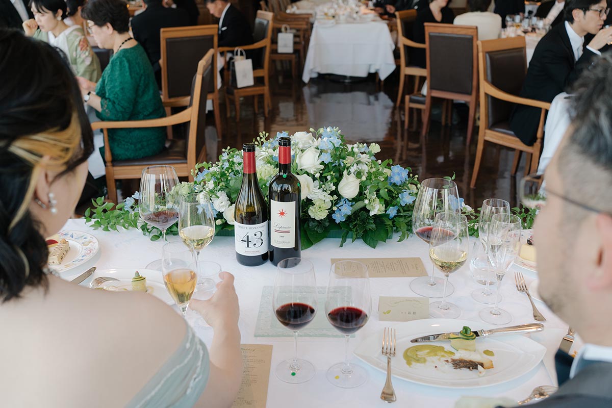 とにかく皆さんに気兼ねなく楽しんでもらえる演出がしたいと考えていたので、プランナーさんにご提案いただいた「格付けチェック」を実施することにしました。某テレビ番組で使用されているBGMを探して準備し、ワインとチョコレートを会場にご用意いただき、テーブル対抗にしました。皆さん、違いはわかるものの、なかなか当てることは難しかったようで、大変盛り上がりました。立派なワインセラーがある、高級感のある会場なので、この演出と雰囲気もマッチしていました。特に、ワインの正解発表は、会場のソムリエの方が、丁寧にご説明いただき、本物感を味わえました。私達も挑戦できて、一緒に楽しめたのも良かったです。