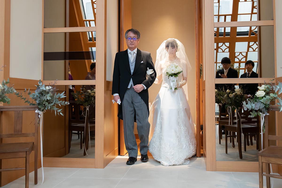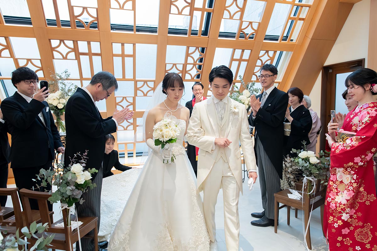 私たち自身やゲストがお花が好きなこともあり、左右に白を基調とした大きな花を追加で飾っていただき、チャペルがより華やかになるようにしたことも、こだわったポイントの1つです。披露宴の最後には、新婦から父への手紙を読み上げとても良い雰囲気で式を終えることができました。