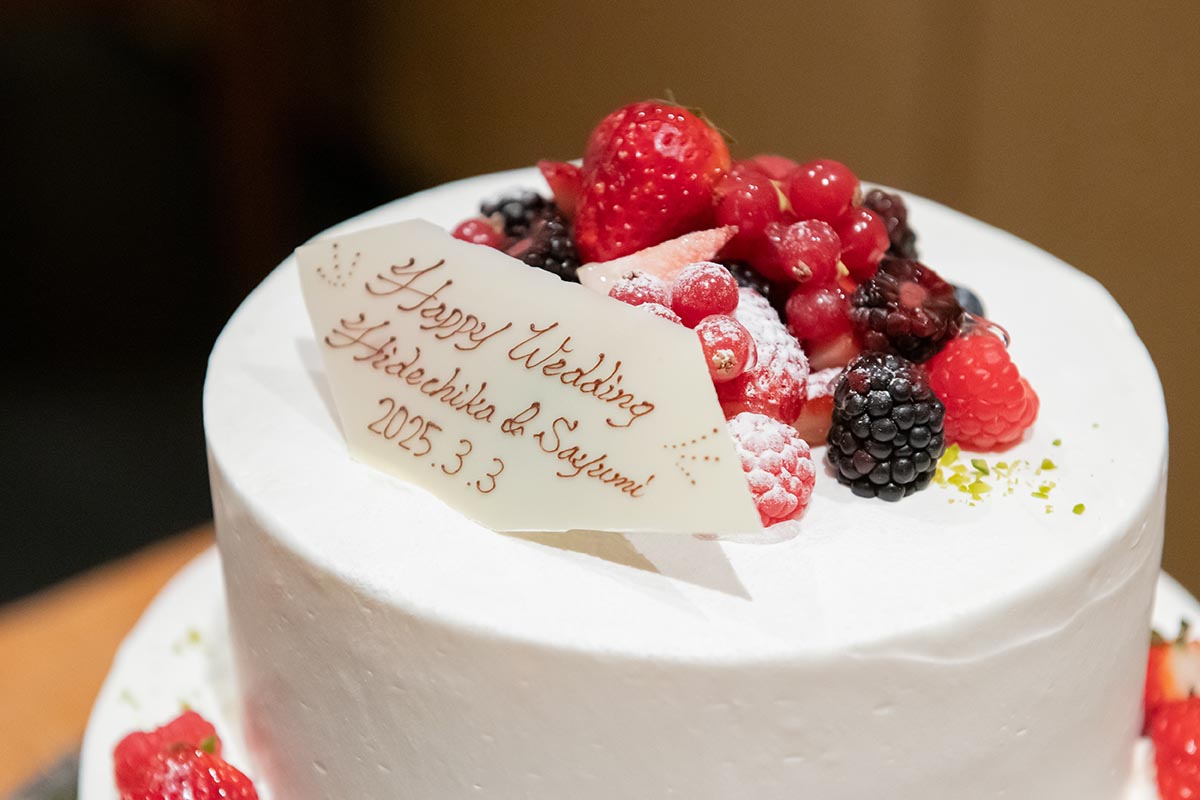こだわりのポイントは手作りのゲスト参加型のウェルカムボードを作成したことです。「結婚生活で大切にしてほしいこと」と言う質問で、選んだ問いの色の造花をケースの中に敷き詰めてもらい、世界で一つだけの結婚記念品を作りました。ゲストの皆さんに、待ち時間にもちょっとした楽しみがあればという思いでゲスト参加型のウェルカムボードにしました。