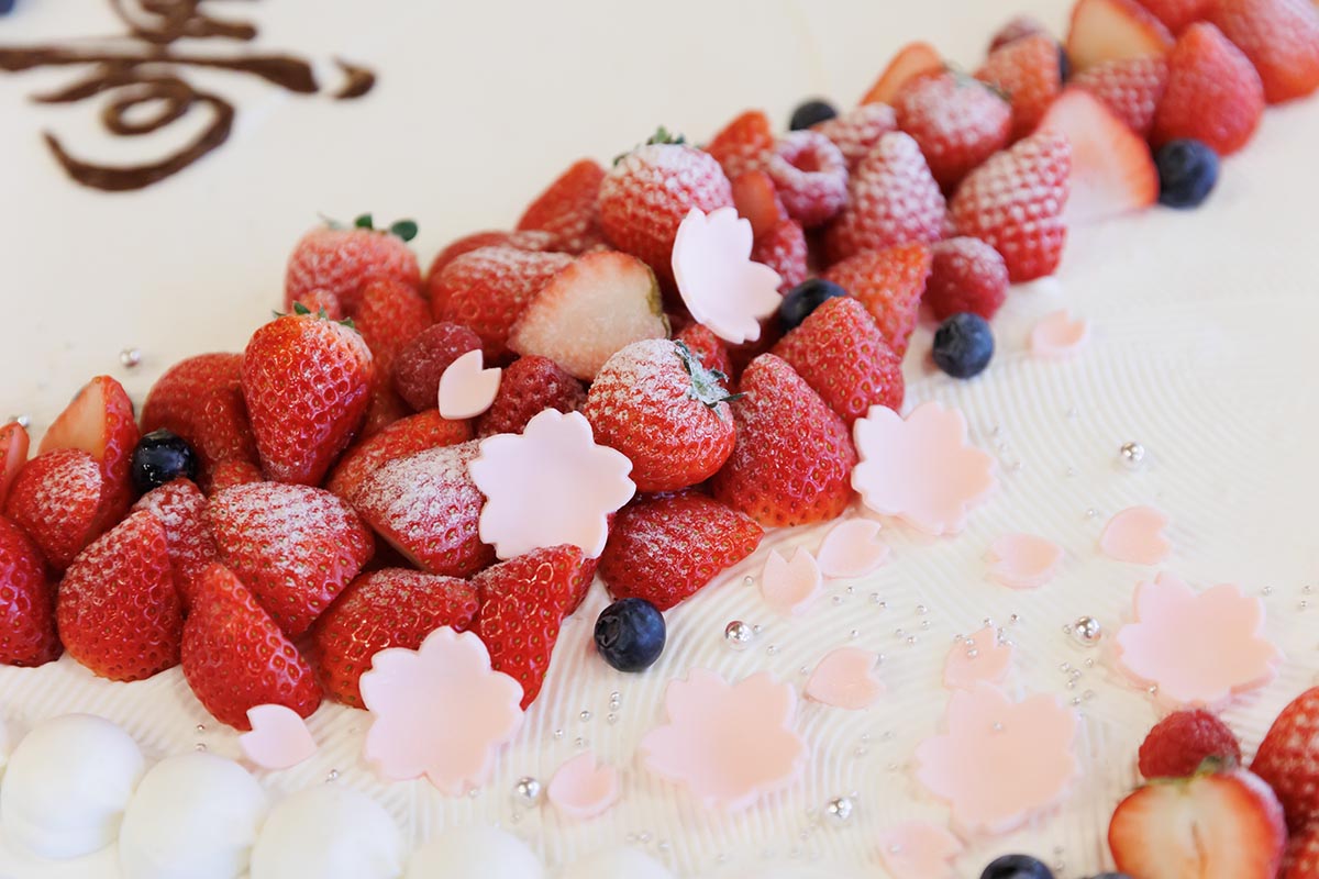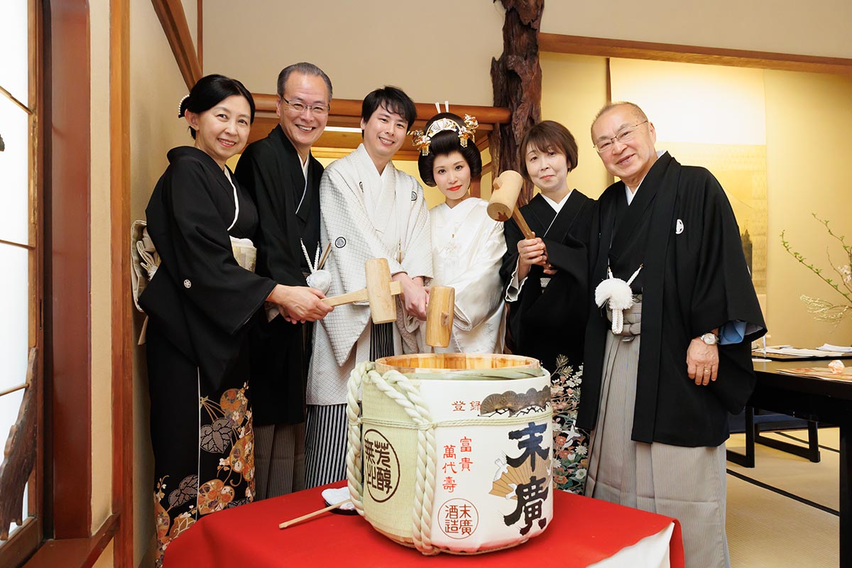 そこで、席札はお米の入った袋に名前を書いたものを用意したり、テーブルの装飾も折り紙で作られた毬や鶴、亀などを用意し飾り付けてもらいました。ケーキ入刀も桜をイメージしたデザインにし、また酒樽を木槌で割る鏡開きも行い日本酒をふるまうなど和の心を散りばめてみました。