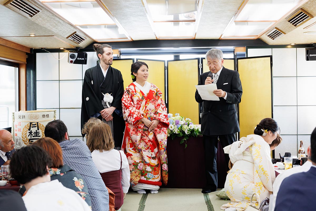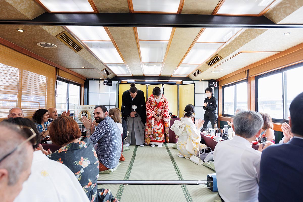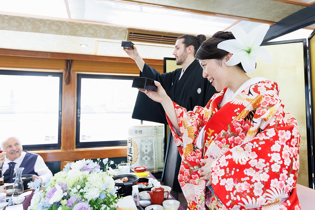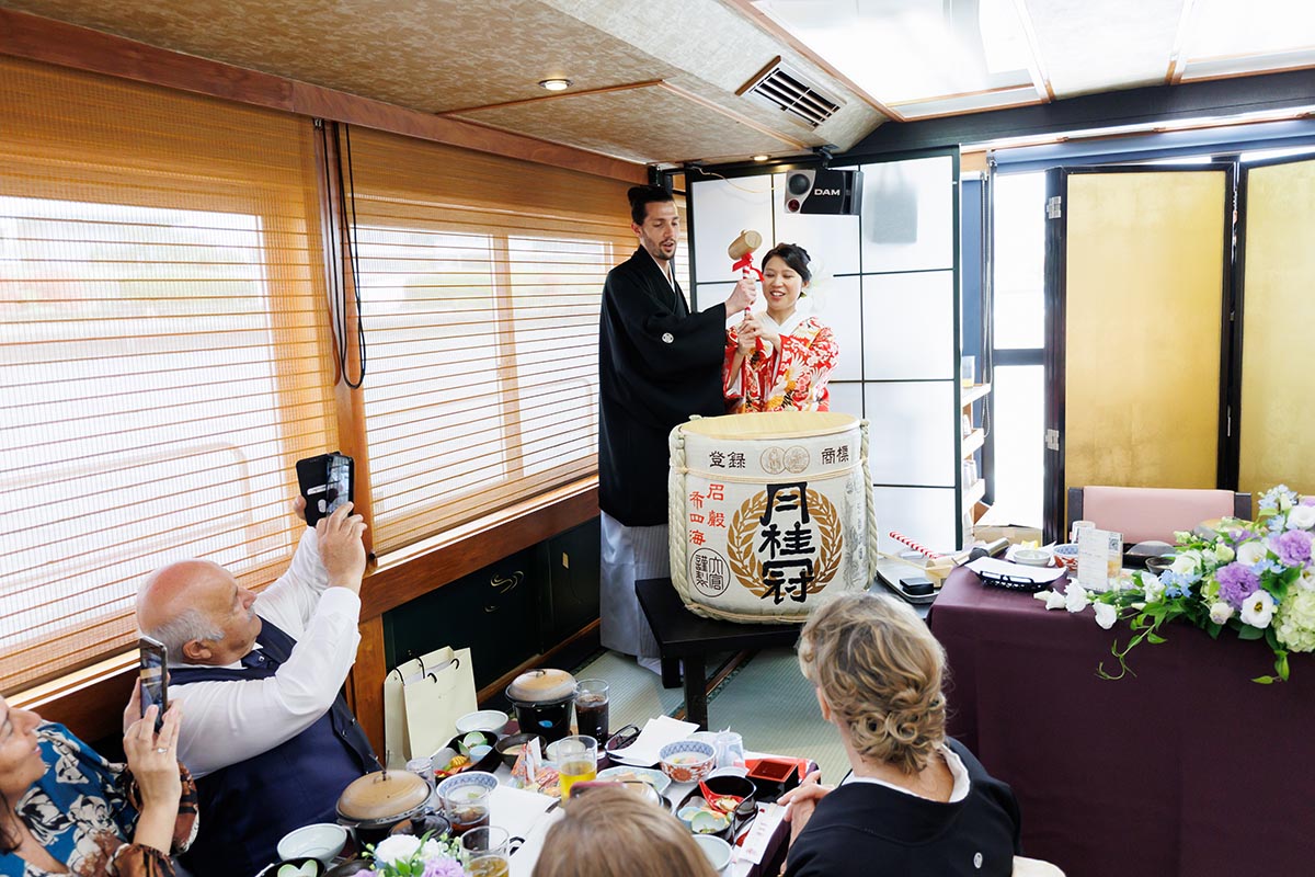 私たちは新郎がイタリア人、新婦が日本人の国際結婚だったのですが、今回の挙式が日本の神前式であり、披露宴が屋形船を選んだため、伝統的な「和」だけに偏らないように演出を配慮しました。イタリアからきてくれたゲストにも楽しんでもらえるようにイタリア語の歌の演出を用意しました。また日本の文化を外国のゲストにも体験してもらいたく、鏡開きも実施しました。美味しい日本酒を一緒に楽しめたと思います。最後に、ゲストの全員がその場の雰囲気を理解できるようにバイリンガルの司会者をお願いしました。