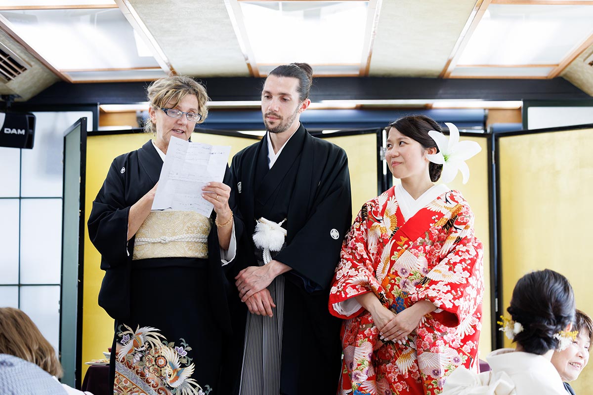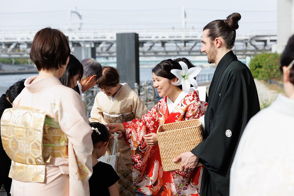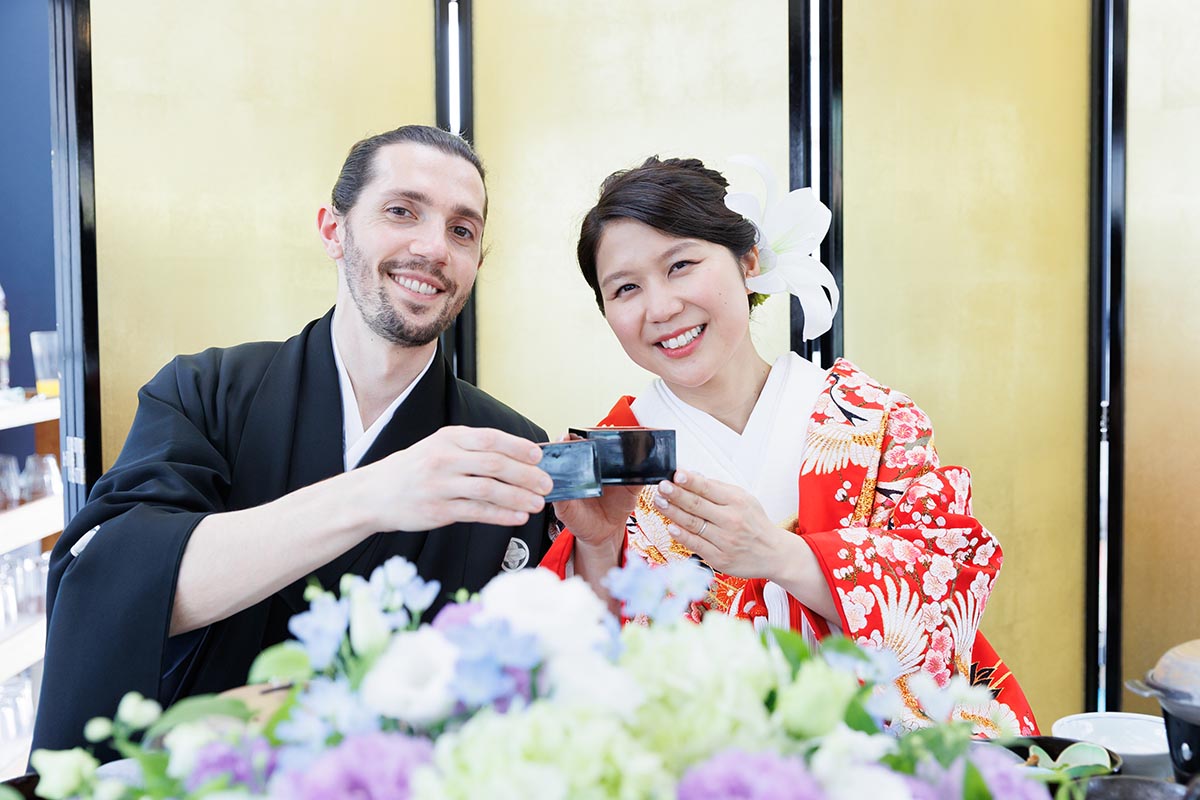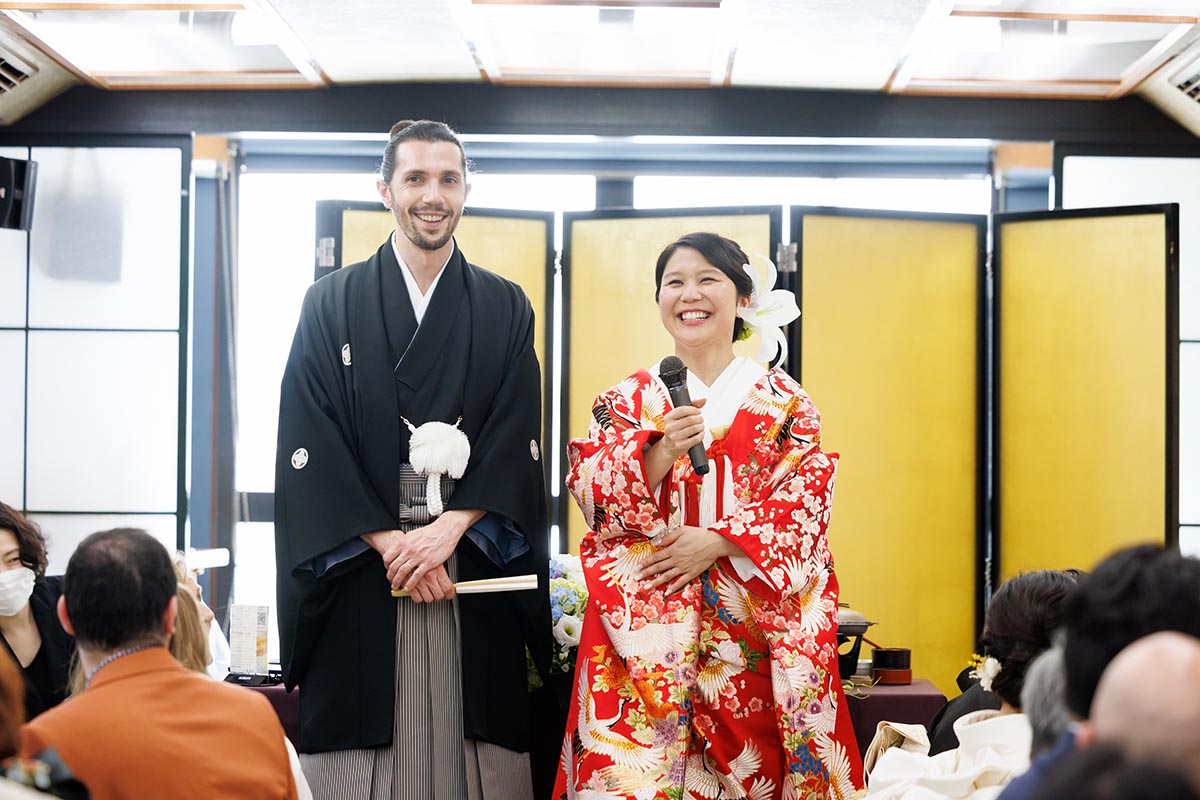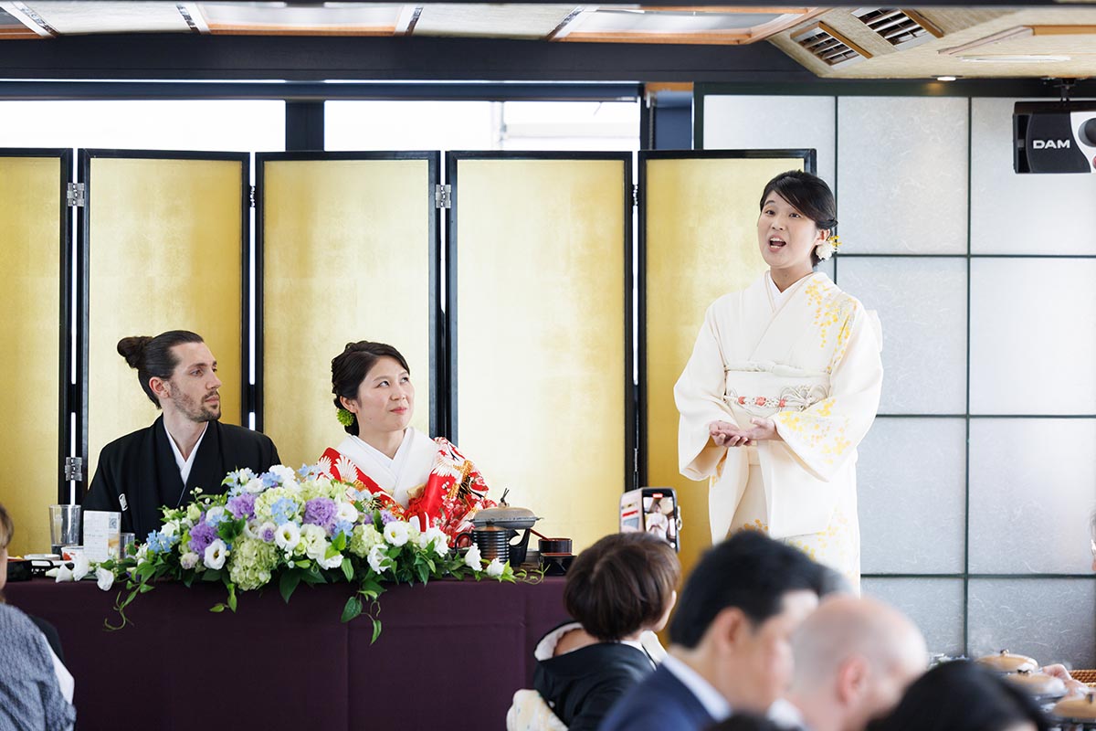私たちは新郎がイタリア人、新婦が日本人の国際結婚だったのですが、今回の挙式が日本の神前式であり、披露宴が屋形船を選んだため、伝統的な「和」だけに偏らないように演出を配慮しました。イタリアからきてくれたゲストにも楽しんでもらえるようにイタリア語の歌の演出を用意しました。また日本の文化を外国のゲストにも体験してもらいたく、鏡開きも実施しました。美味しい日本酒を一緒に楽しめたと思います。最後に、ゲストの全員がその場の雰囲気を理解できるようにバイリンガルの司会者をお願いしました。