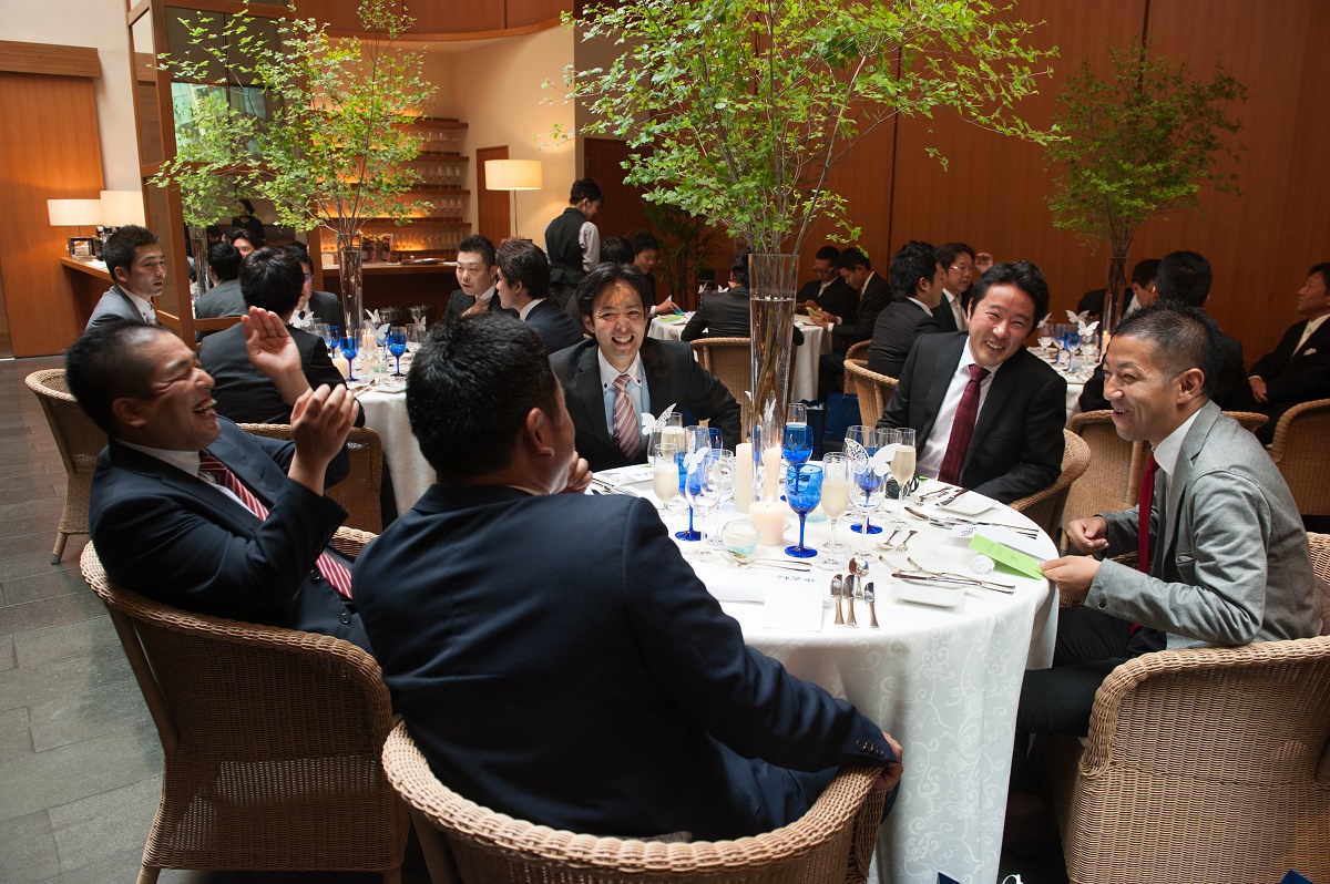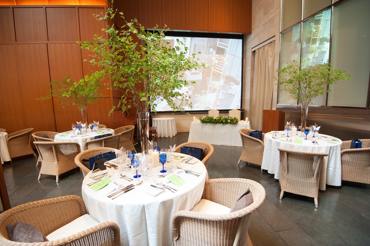 次に会場は、自然光を取り入れられる天窓、開放感あふれる高い天井がとても素敵です。そしてリゾートに来たようなゆったりとしたクッション付の椅子がとても心地よく、ゲストにくつろぎながら都心の真ん中とは思えない雰囲気を味わっていただけます。