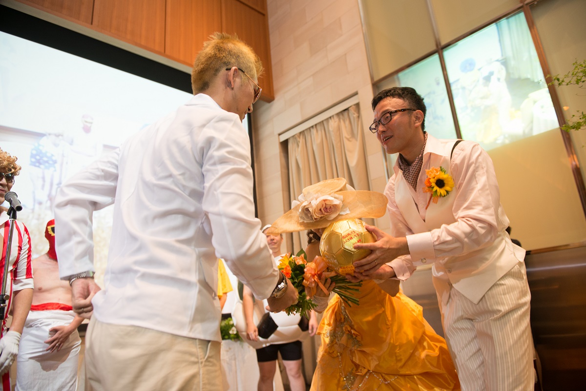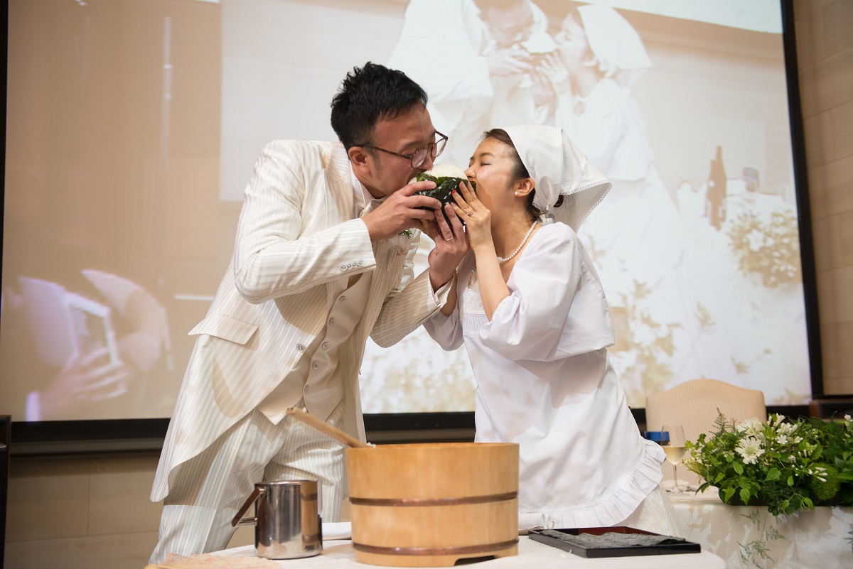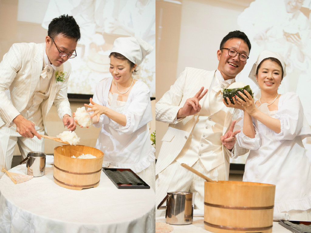 一つ目は、ケーキ入刀です。といっても実際はケーキではなく、塩むすびセレモニーを行いました。(新婦が塩むすび大好き!おひつに炊いたご飯を用意し、ウエディングドレスの上から割烹着を着て顔の大きさほどもある塩むすびを夫婦協働作業で一つ握り、両側からかぶりつきました)式後の周りからの評判も絶大!!印象に残る演出になりました。