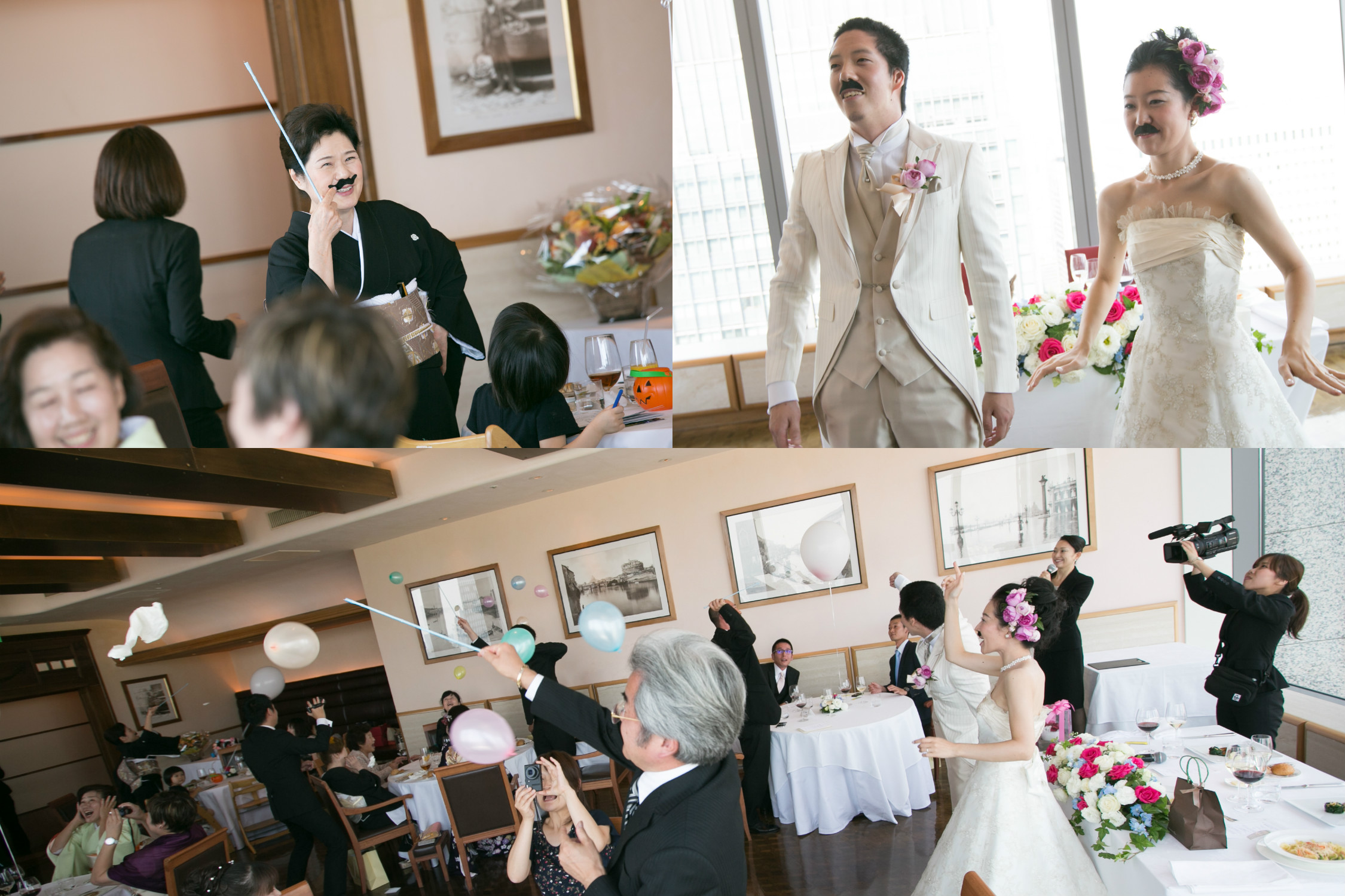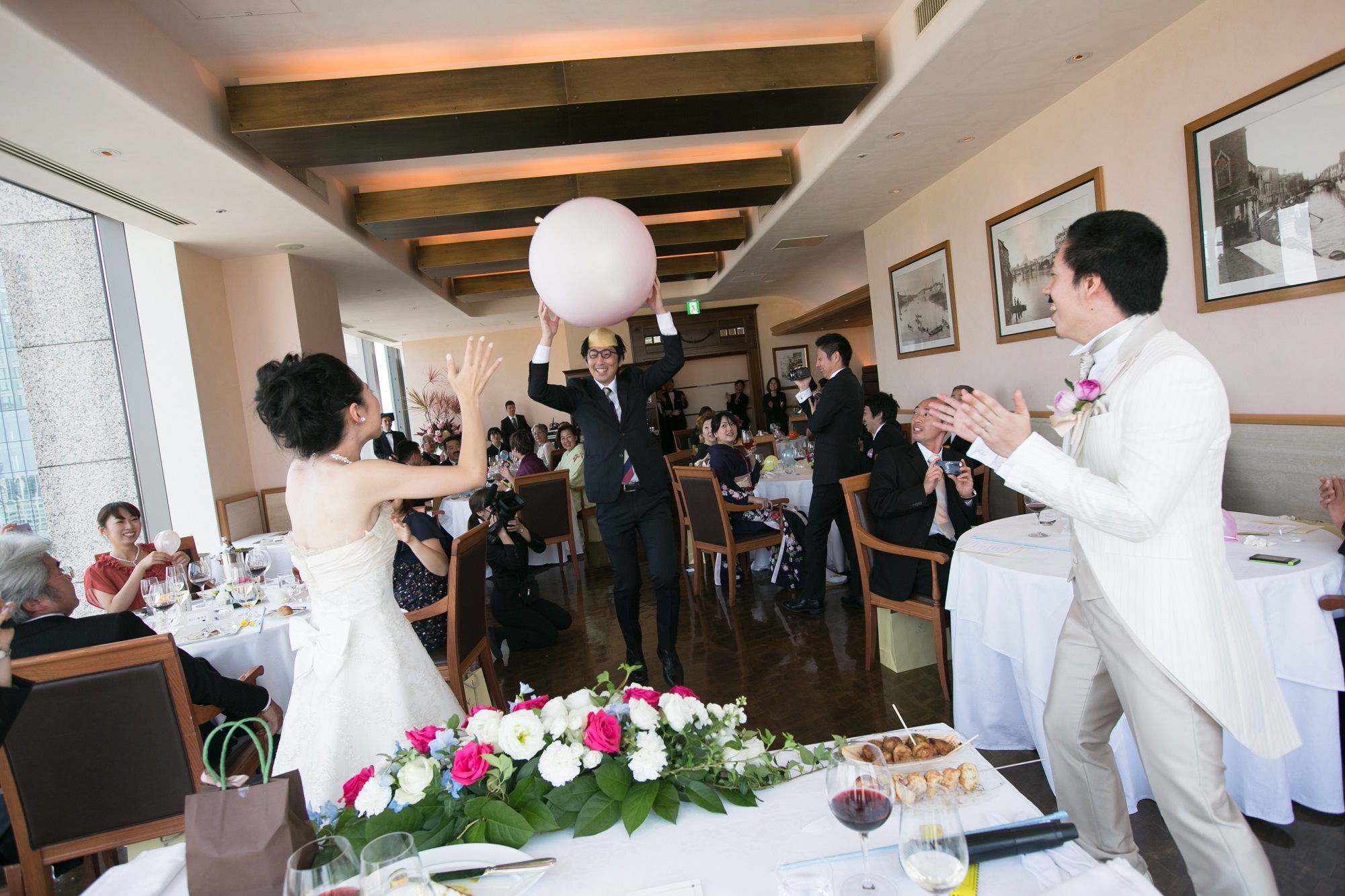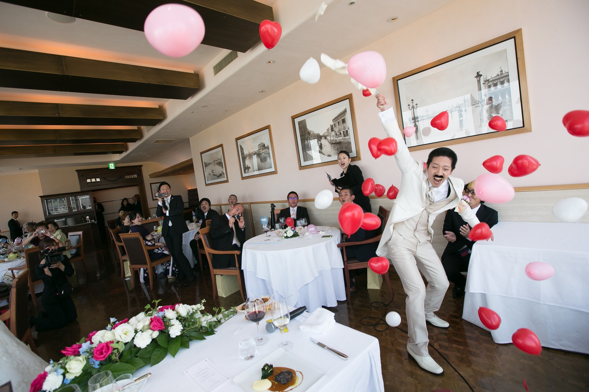 両親とゲストの皆様に食事を楽しんでいただきたかったのと、自分達がおもてなしをしようと思いましたので、余興も2人で考えて行うことにしました。バルーンスパークやコント、ゲスト皆様に参加して頂けるように色々と一緒に考えて下さいました。 とにかくやってみたい事はダメ元でもお伝えしてみることでしょうか。会場に(つくり的に)よってできない事があっても、理想とするところへもっていって下さいます。コンセプトも整理してくれ、楽しんでいただく所に焦点を合わせ形にしていくので、本当に最高の余興になりました。 これから式を挙げられる皆様も一生に一回のイベントですので、その思いを伝えてみて下さい。必ず素敵な披露宴にして下さいます。